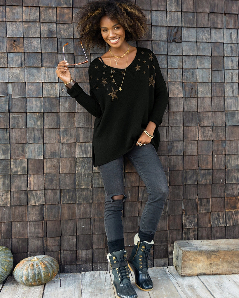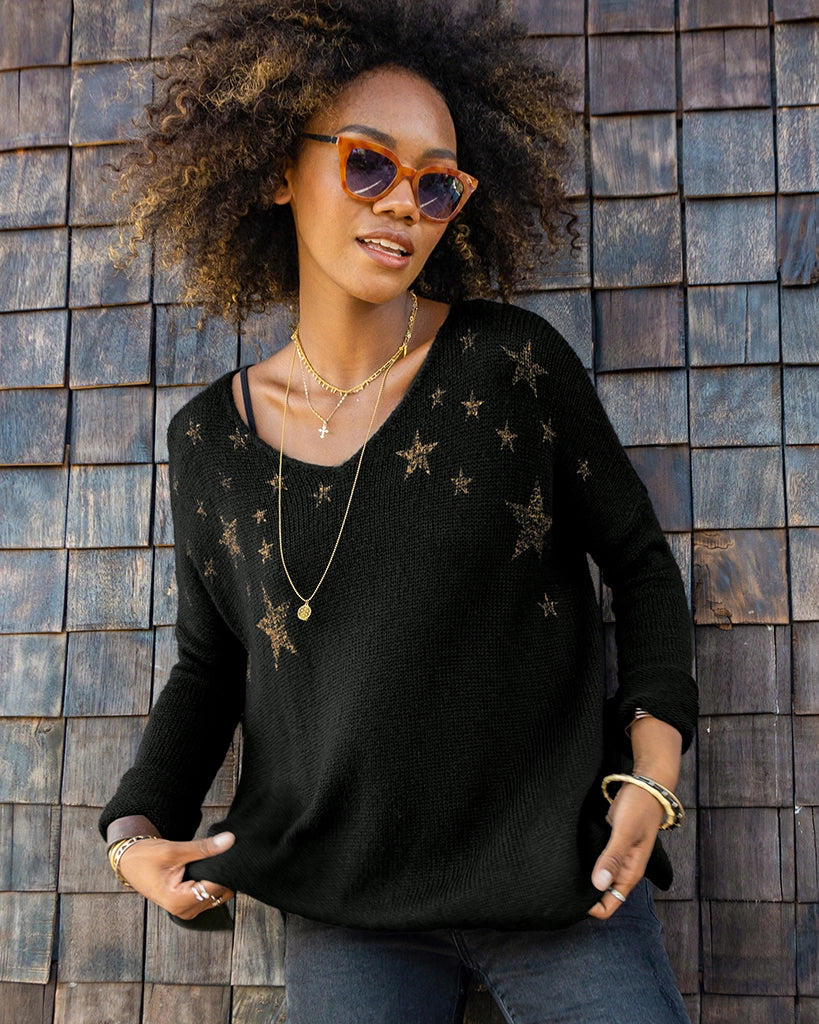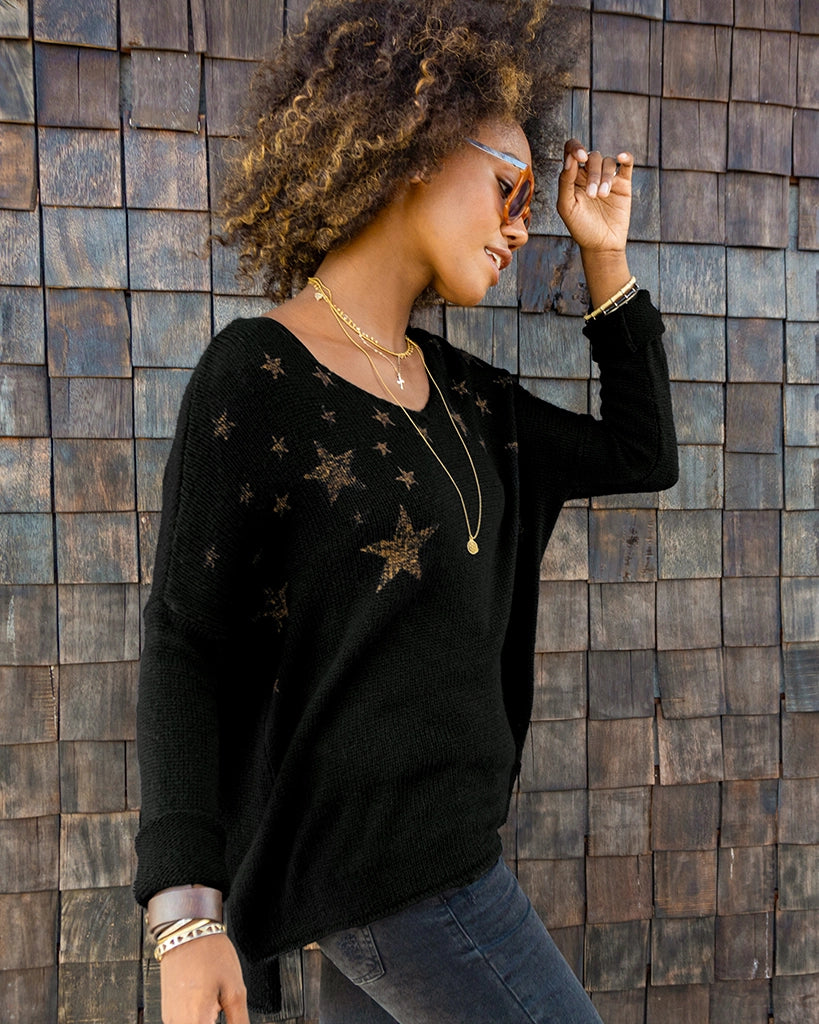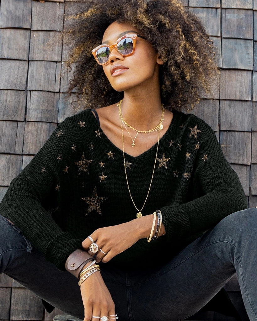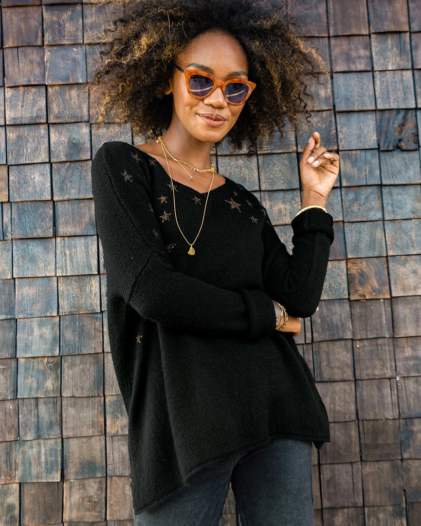 Tissue soft and lightweight v-neck with metallic stars screen printed by hand on the front of the sweater. The open v neckline is flattering and keeps this top feeling light and airy. Oversized, boxy fit with a fitted sleeve.