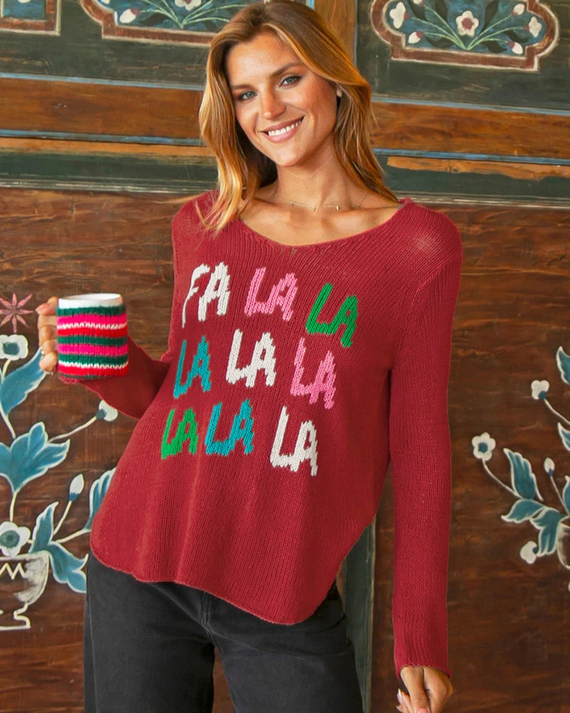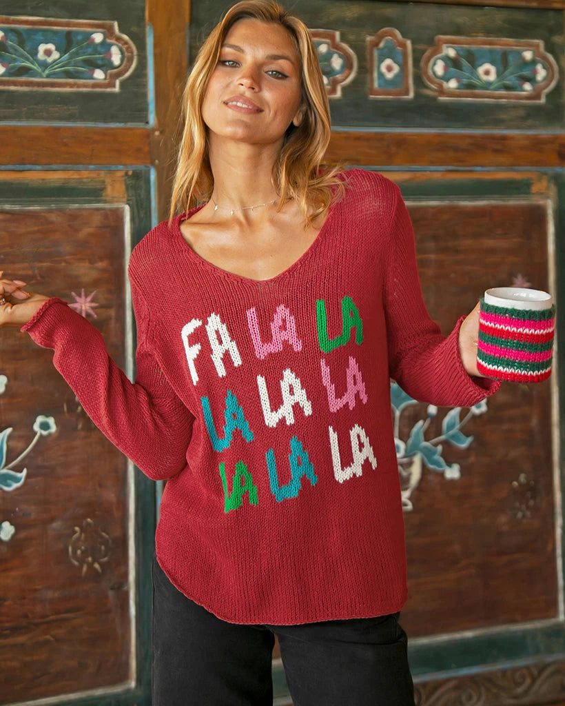 Festive, fun, and perfect for Christmas! This tunic-length V-neck sweater has a flattering, relaxed fit, with the holiday-themed phrase knit directly into the sweater. Details include a rounded hem with side slits, making it super versatile—tuck it, knot it, belt it, or wear it loose.