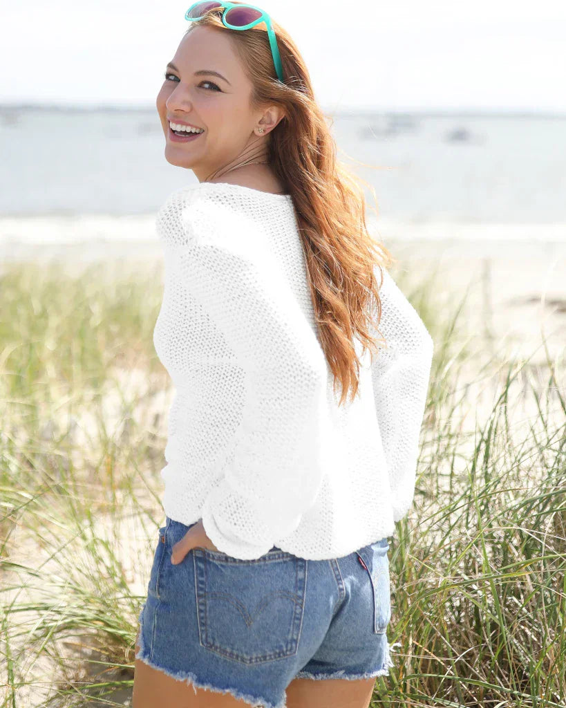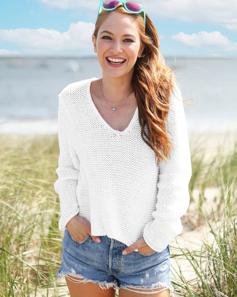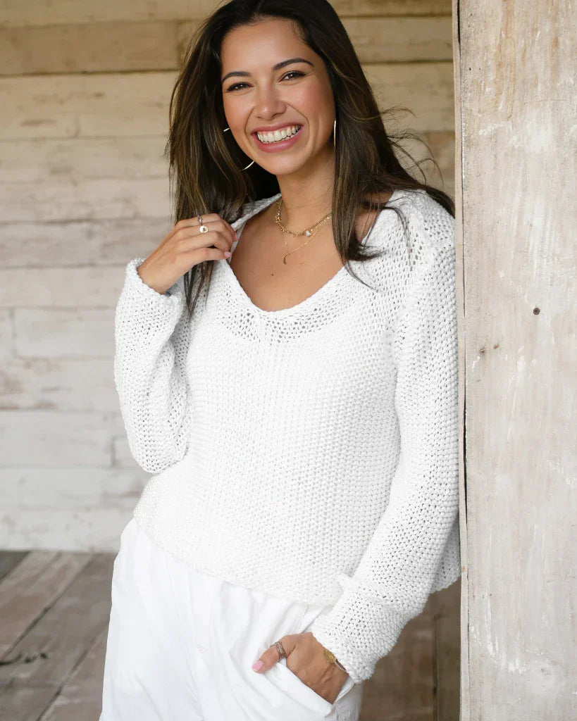 Meet your new favorite everyday knit! This soft, lightweight, and breathable top is knit with an open construction for an airy feel. The cropped, boxy fit, balanced with a deep V is super flattering and keeps you feeling cool. Knit using our cotton blend yarn, this versatile top works perfectly with denim or as a cover-up over a bathing suit.