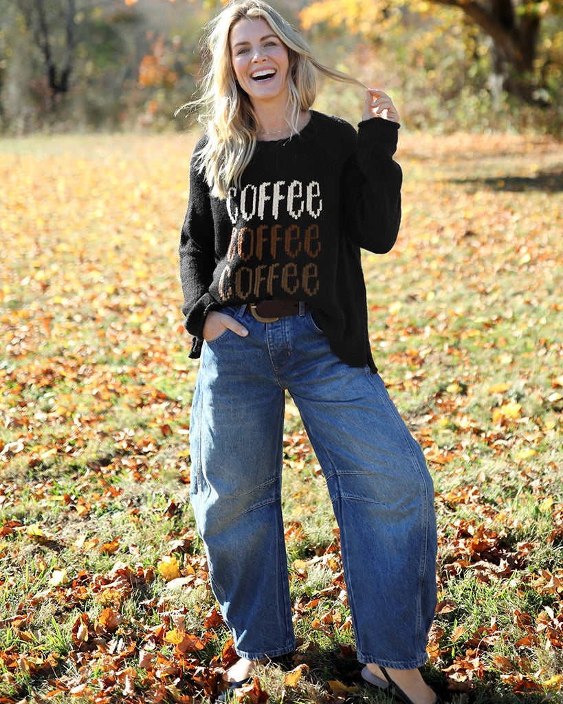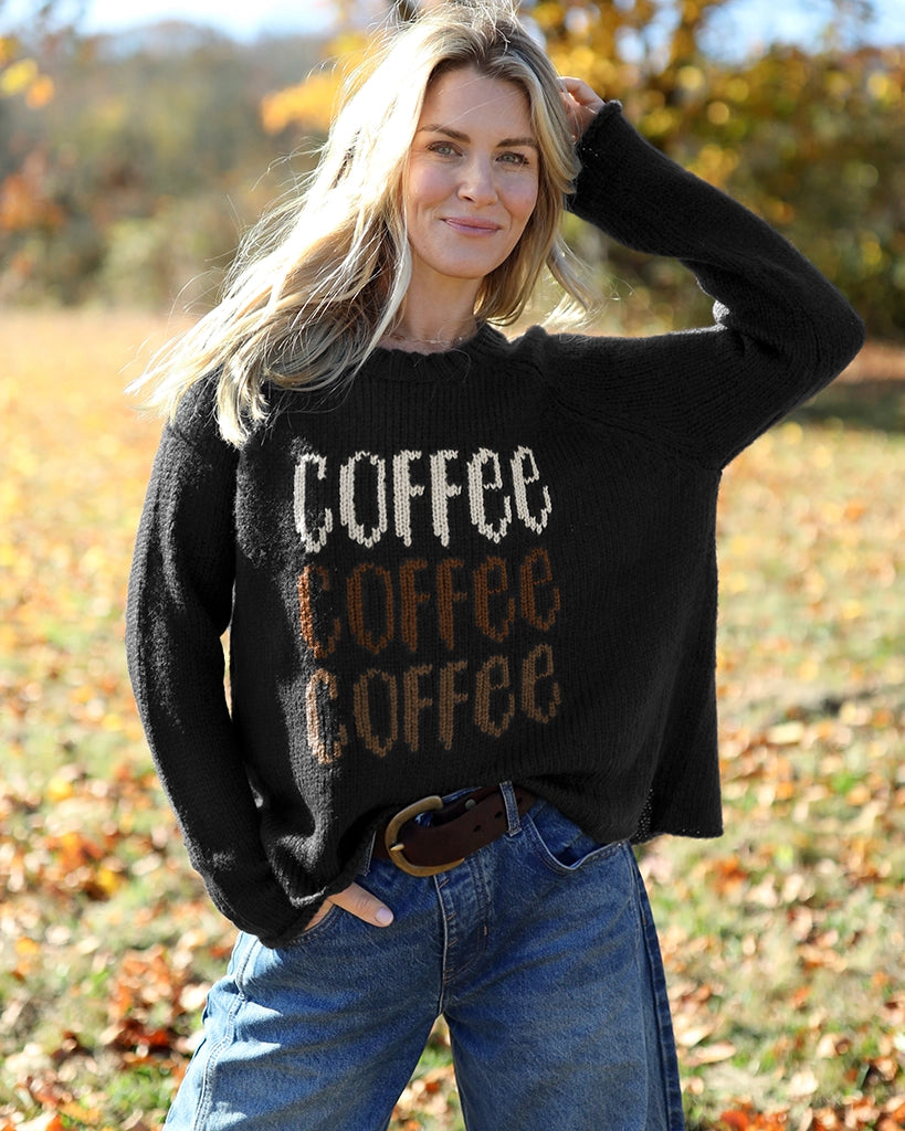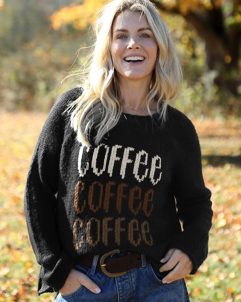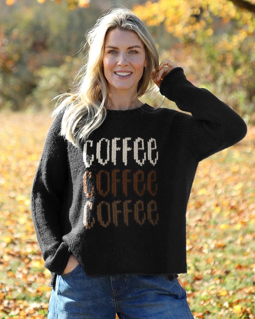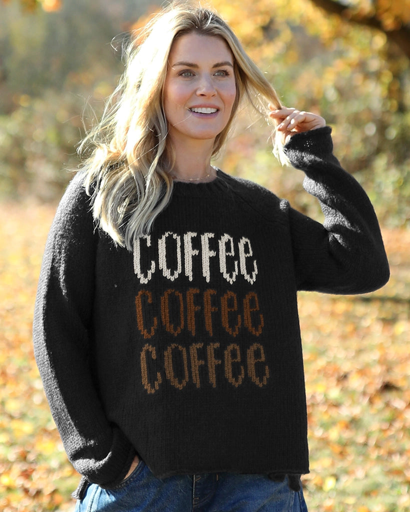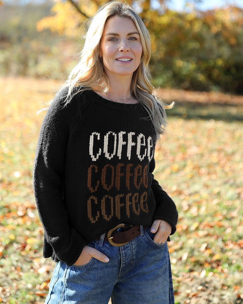 Amazingly soft and cozy boyfriend-fit crew featuring the word “coffee” knit directly into the front in three different shades. Designed with raglan sleeves and finished with ribbed neckline, plus roll-edge details at the cuffs and hem for a relaxed touch.