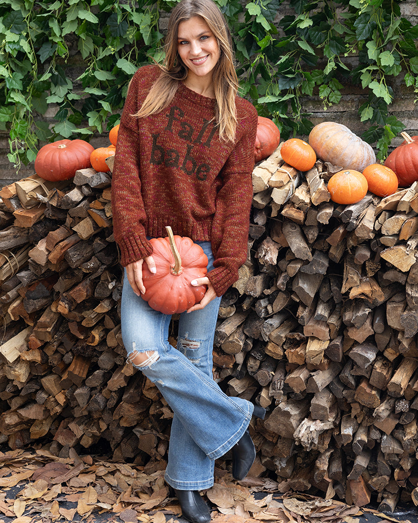 The ultimate boyfriend sweater! This marled knit is insanely soft and cozy. Designed with a relaxed fit and dropped shoulders, it creates a just-loose-enough silhouette that’s both flattering and comfortable. Finished with ribbed crewneck, cuffs, and hem, and features the phrase "fall babe" knitted directly into the center front.