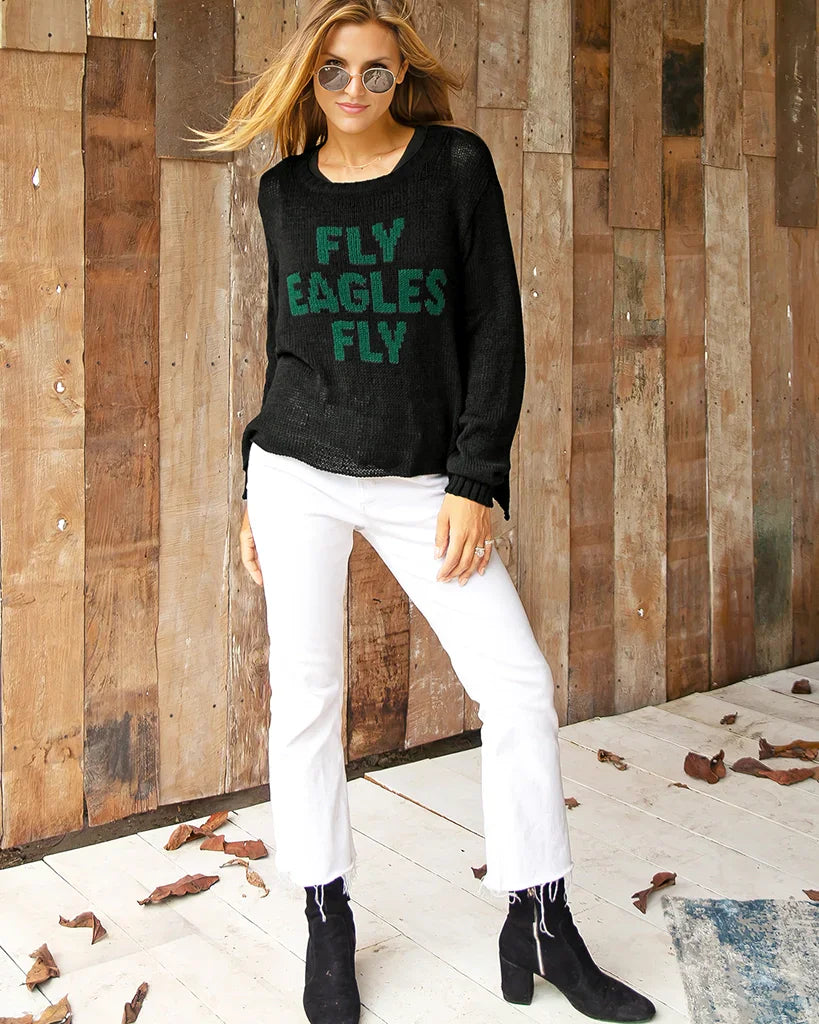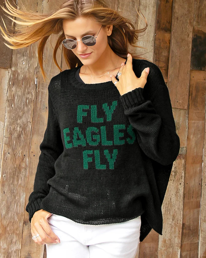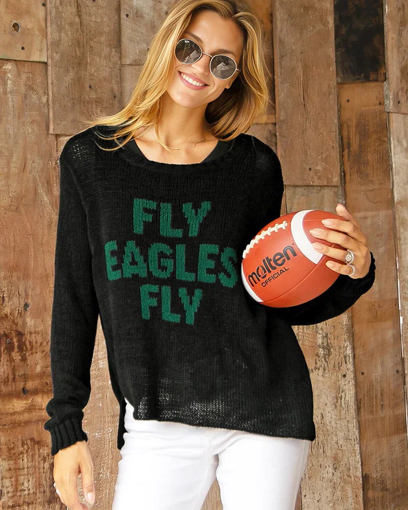 The perfect super soft, light, and breathable cotton blend yarn features the words "FLY EAGLES FLY" knit directly onto the front, making it the perfect layering for supporting your favorite football team in style. The flattering, slouchy fit of the body makes this top a piece you will reach for day after day. Details include ribbing on the cuffs and neckline.