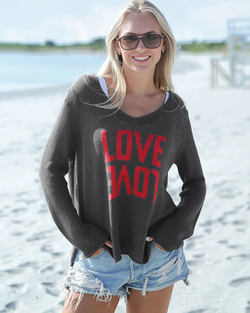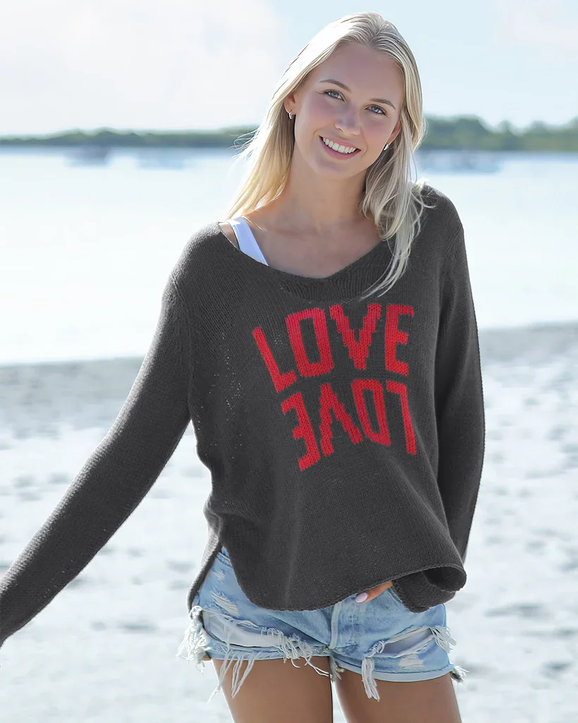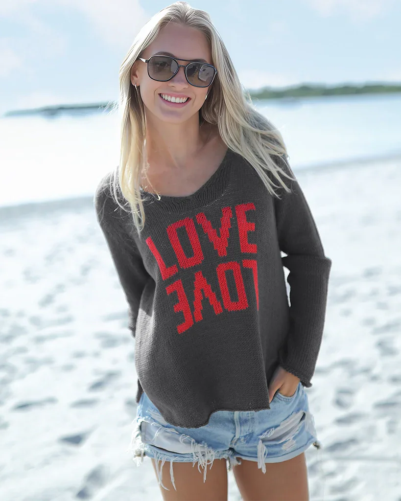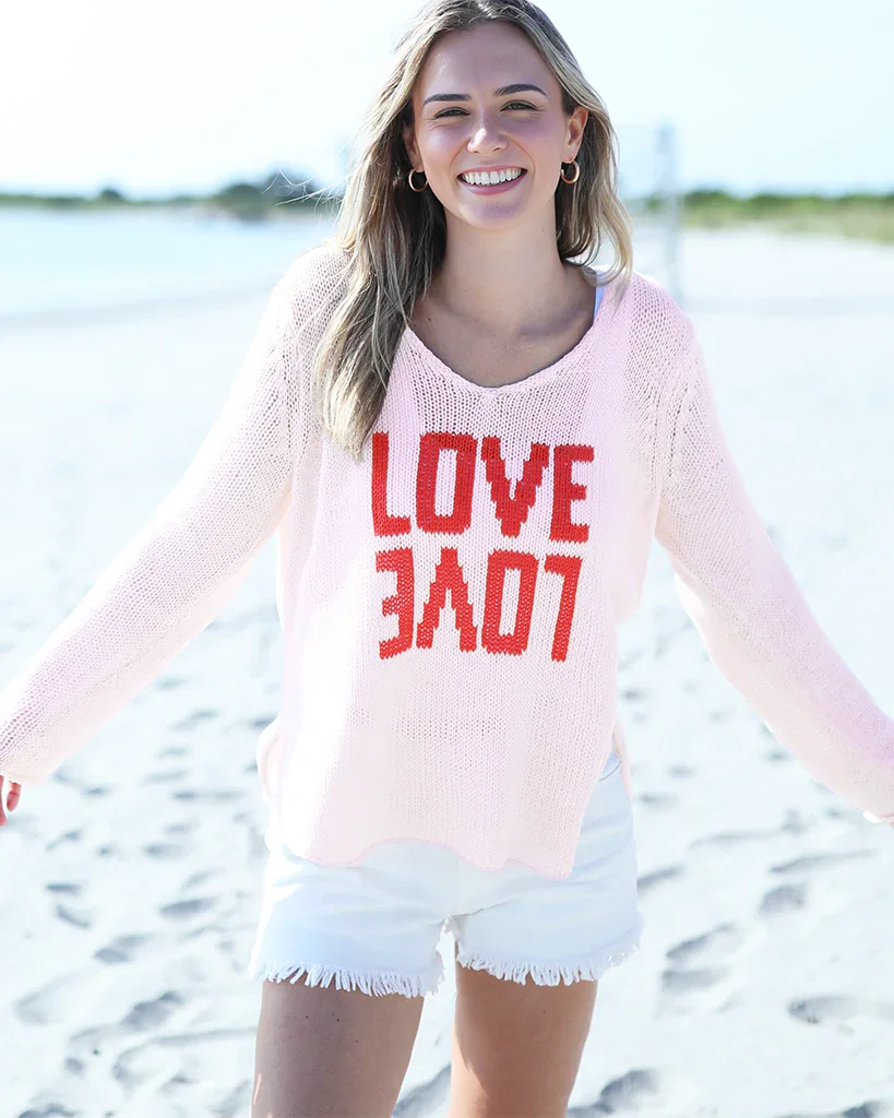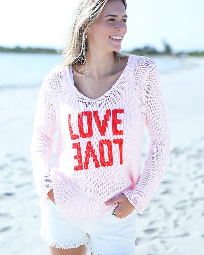 Crafted from a breathable cotton-blend yarn with a soft, easy hand-feel, this sweater is the perfect in-between layer—light enough for daytime, cozy enough for cooler evenings. At the center, the word “Love” is knit in two playful expressions using the intarsia technique, creating a bold, knit-in graphic that feels extra special. Finished with inset long sleeves for a classic fit and a flattering shirt-tail hem for effortless drape, it’s an instant mood-lifter you’ll reach for on repeat. Slip it on and let the love do the talking!
