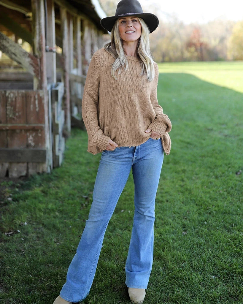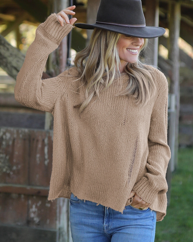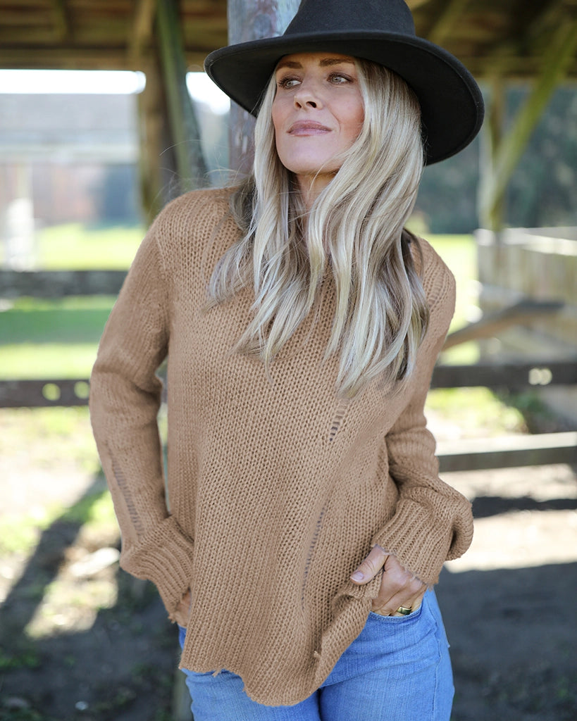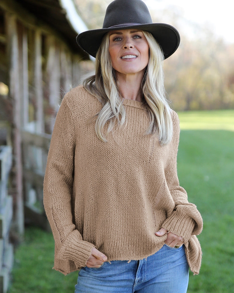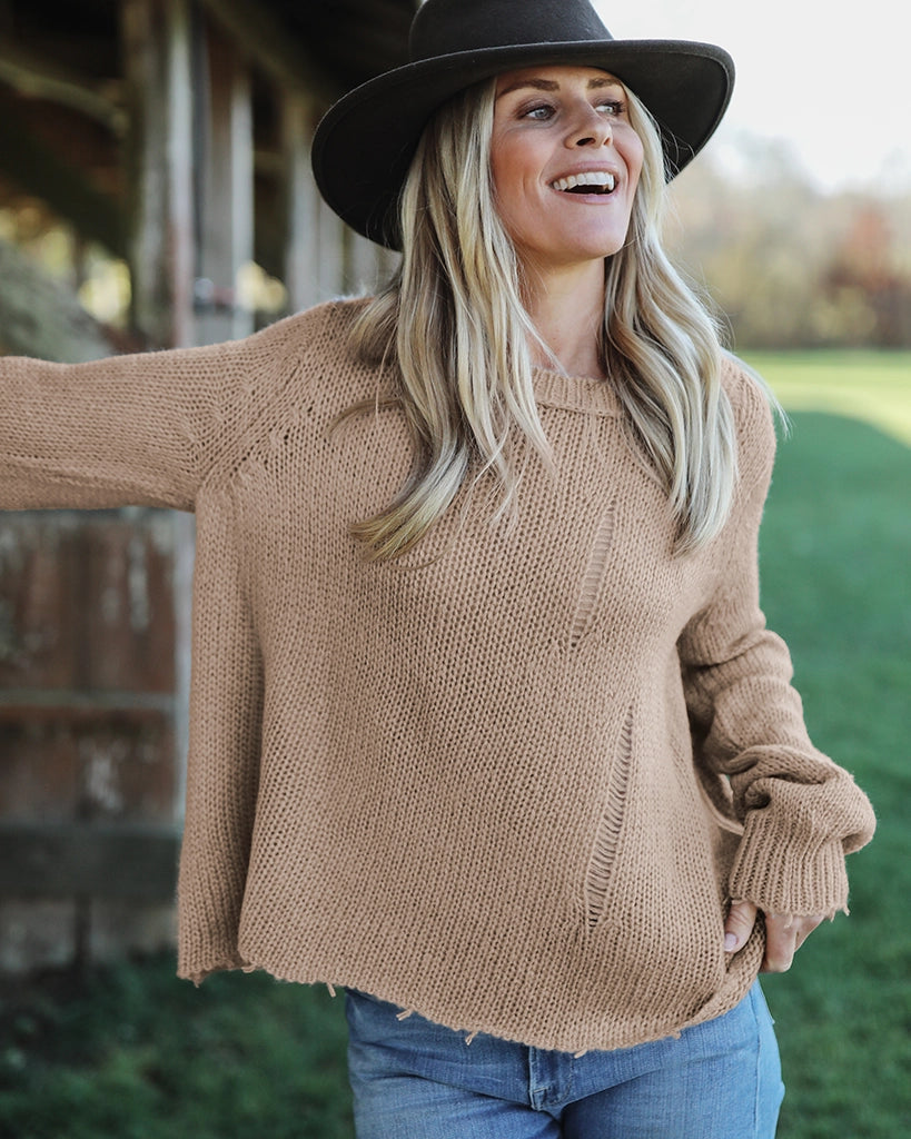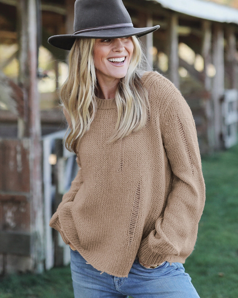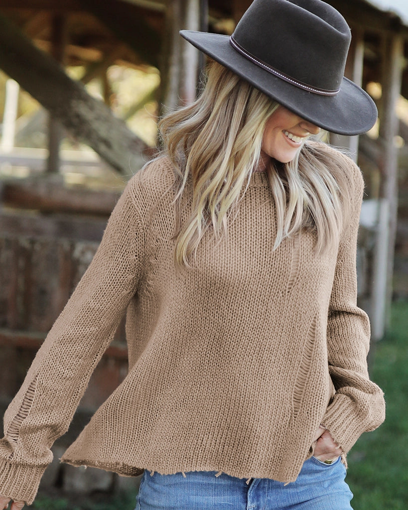 Our top selling Oliver is the perfect way to introduce distressed styling into your fall wardrobe. Made with our buttery-soft wool blend yarn, the Oliver is cozy yet lightweight. Super flattering boxy fit body with a slight crop. Distressing is added throughout the body and sleeves for a laidback look. The hem and cuffs are frayed, adding to the distressed design.