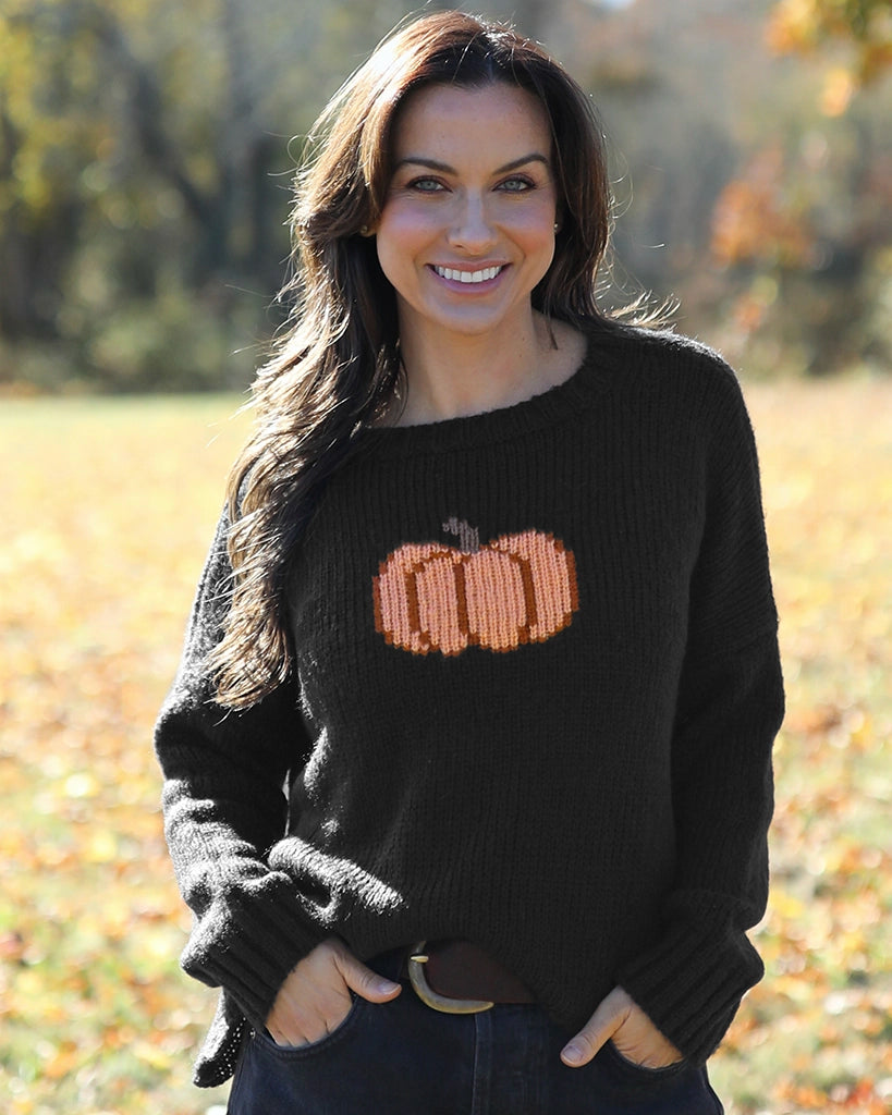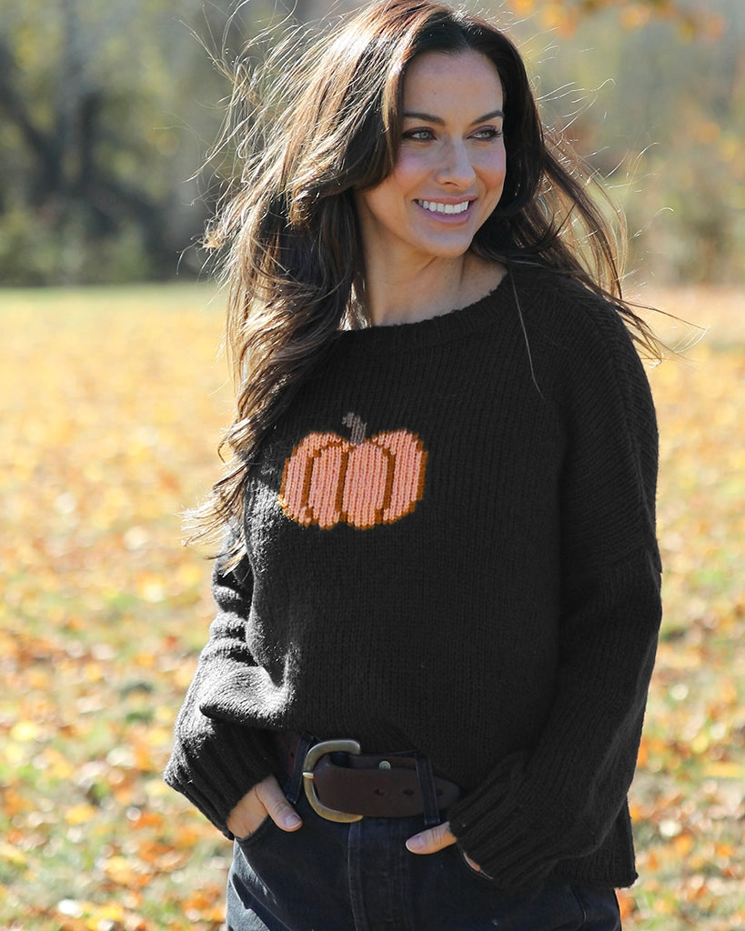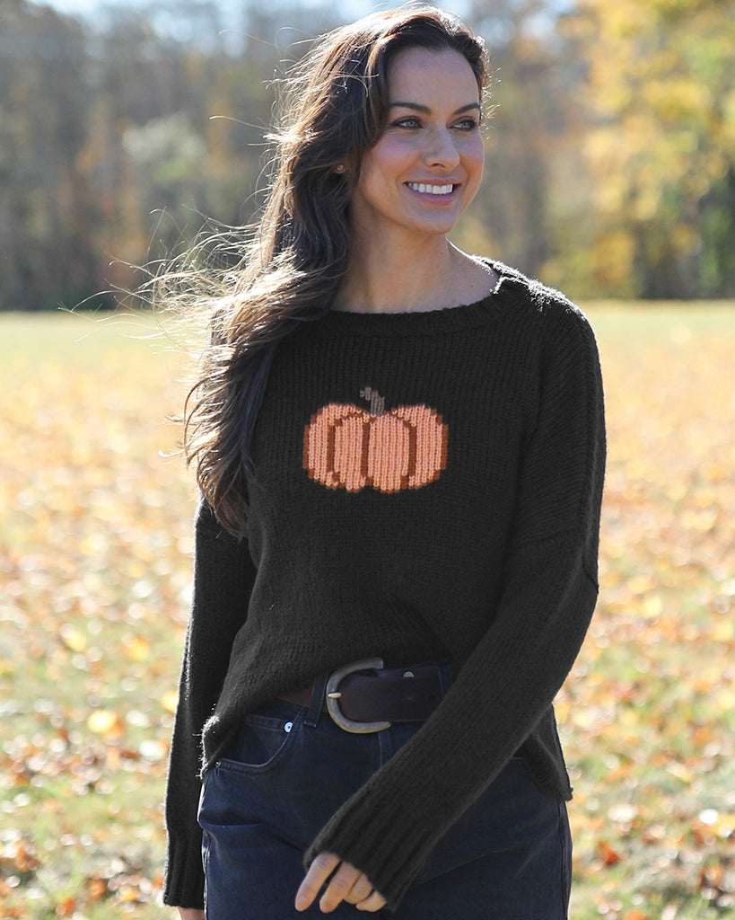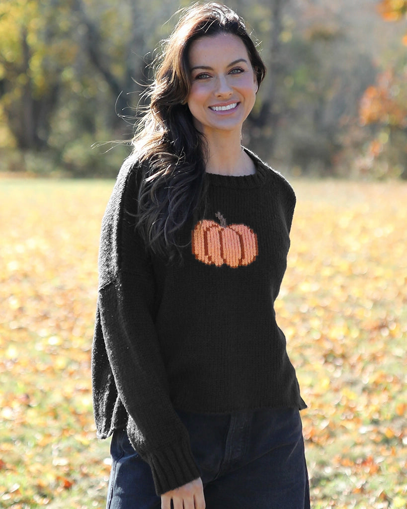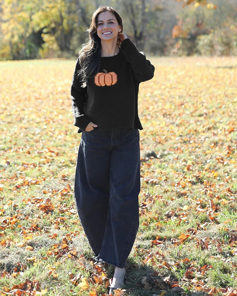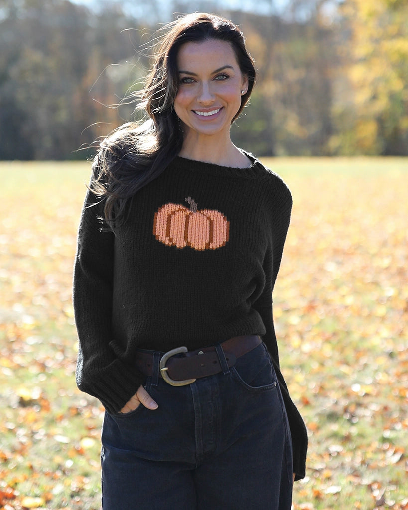 Playful and bold, the PUMPKIN CREW CHUNKY is a super cropped, boyfriend-style sweater featuring a centered pumpkin graphic. Designed with dropped shoulders and finished with ribbed detailing at the crew neckline and cuffs, it's a cozy piece with a seasonal twist—perfect for cooler days or festive moods.