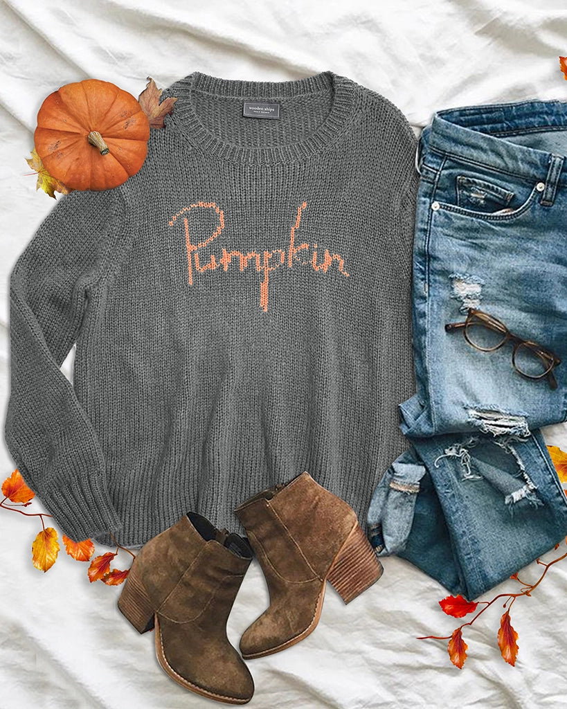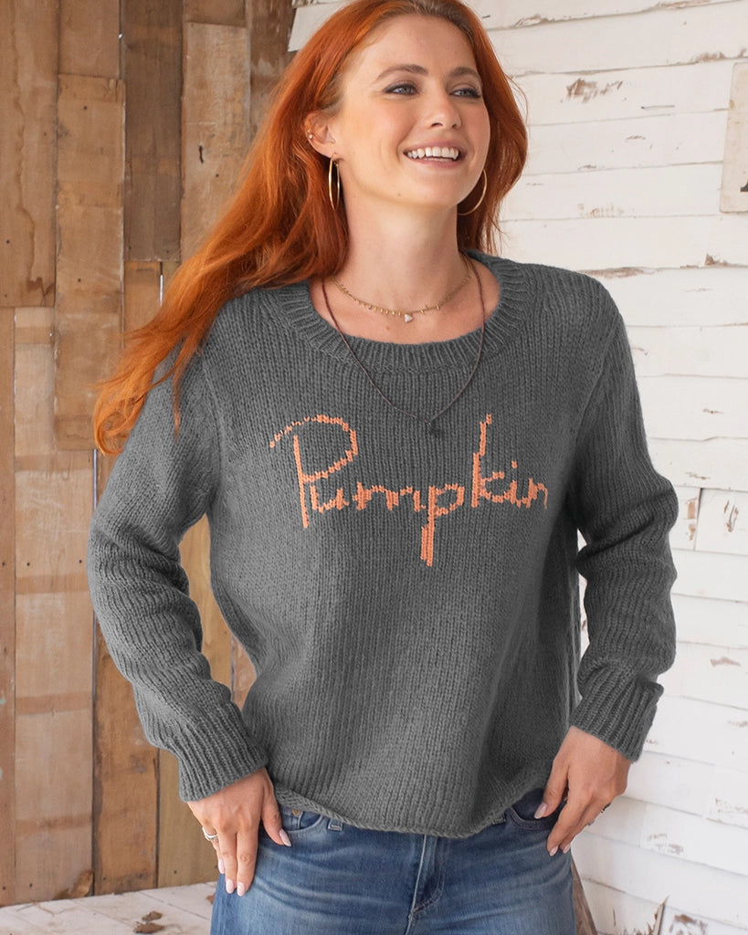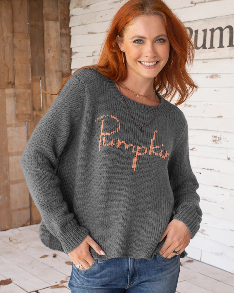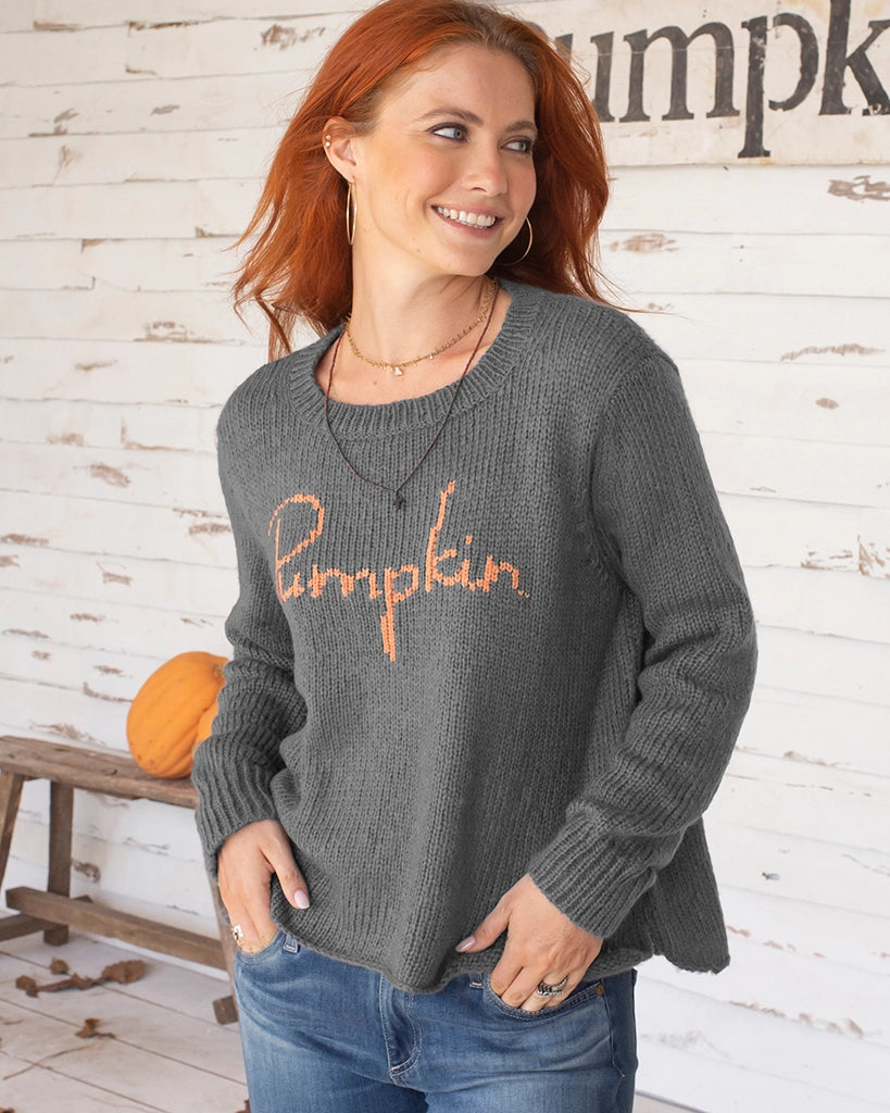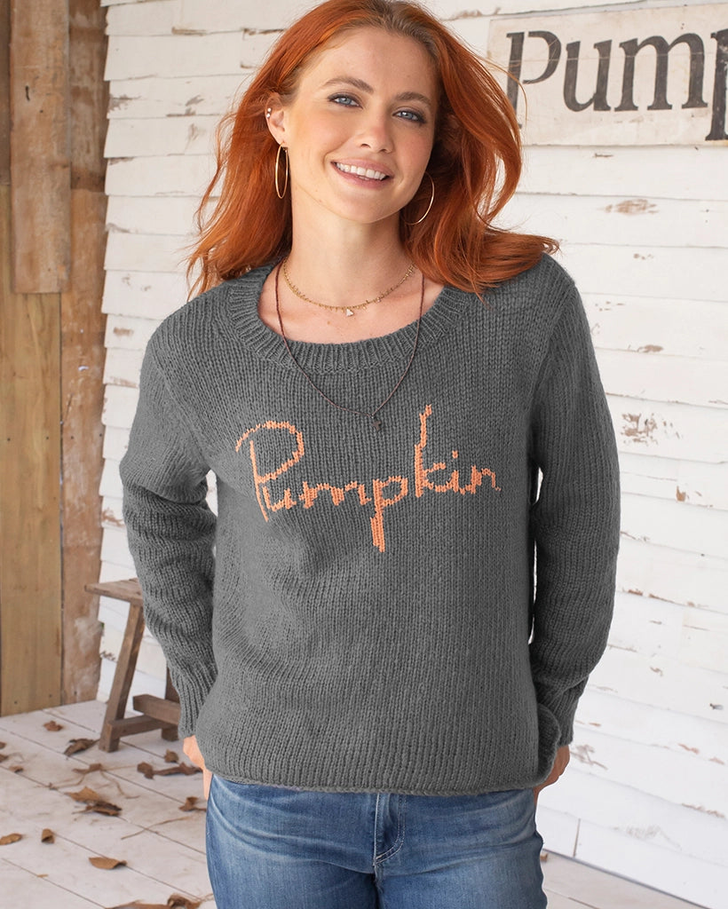 If you love Pumpkin Spice, this is the sweater for you. Incredibly soft and buttery, this cozy knit features the word "Pumpkin" knit directly into the center front. The fit is relaxed, with the perfect amount of slouch. Details include a shirt tail hem with a single stitch finish for a super flattering, flowy look.