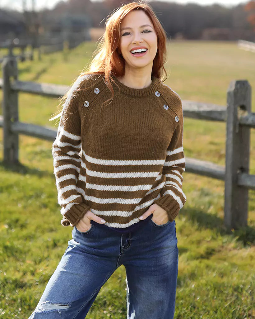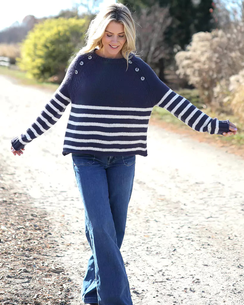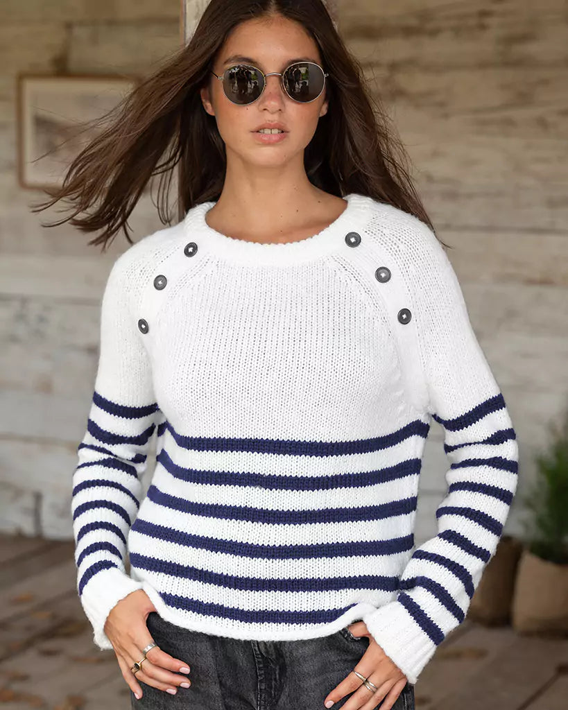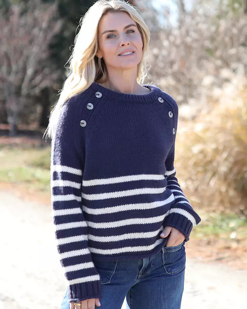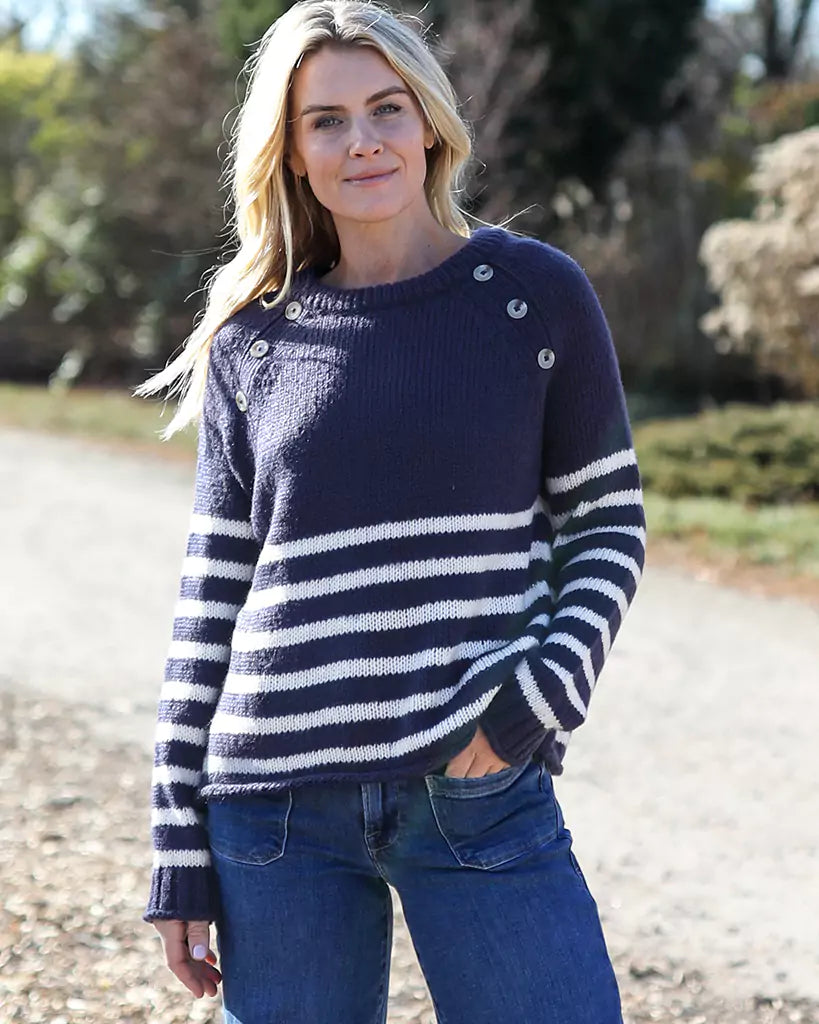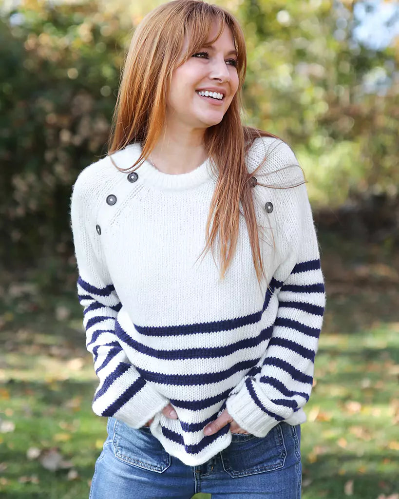 This sweater brings a classic nautical vibe with bold stripes from the mid-body down. Designed with raglan sleeves accented with buttons, it features ribbed finishes at the crew neckline and cuffs. Rolled edges at the cuffs and hem add a laid-back yet stylish touch.