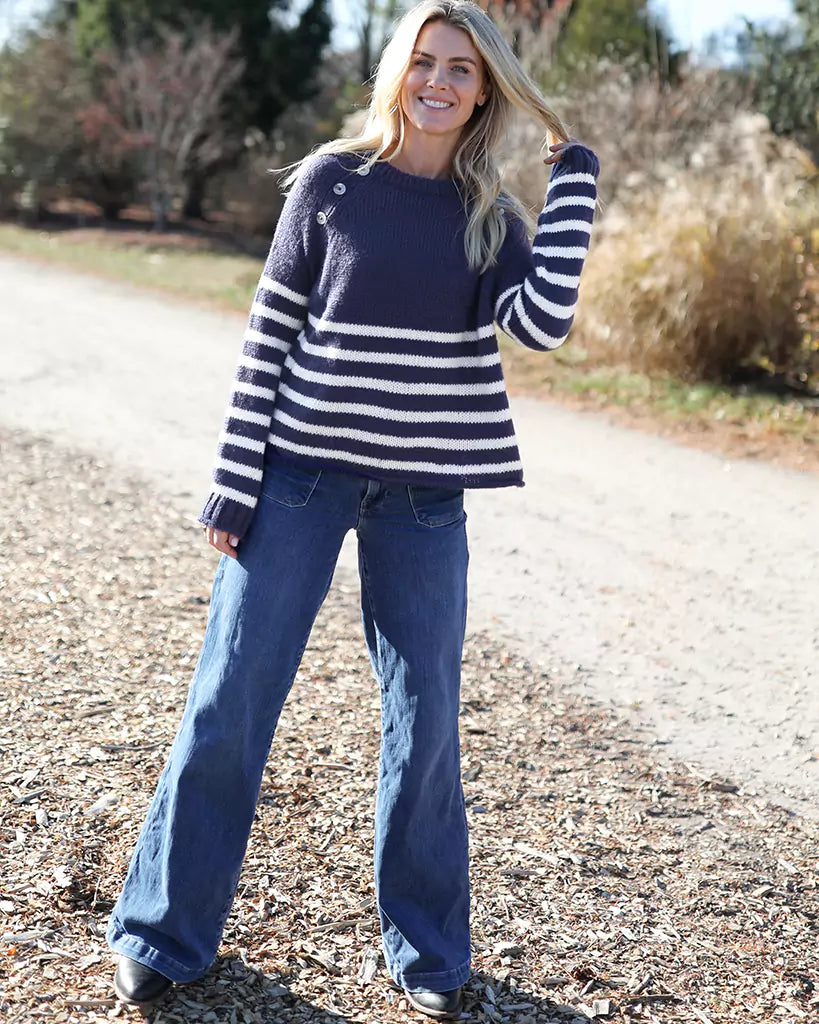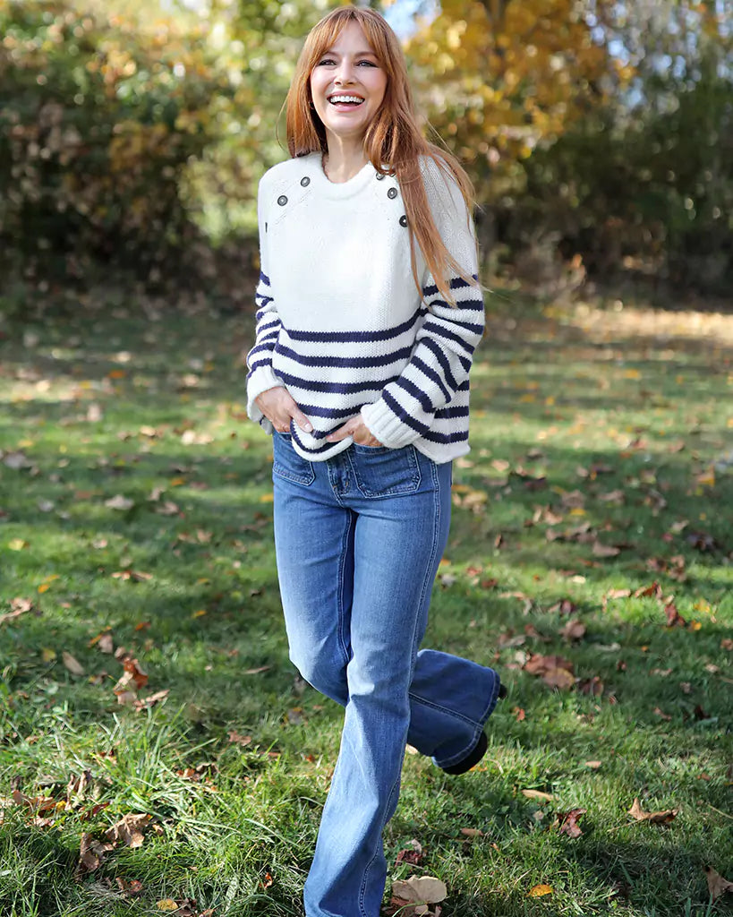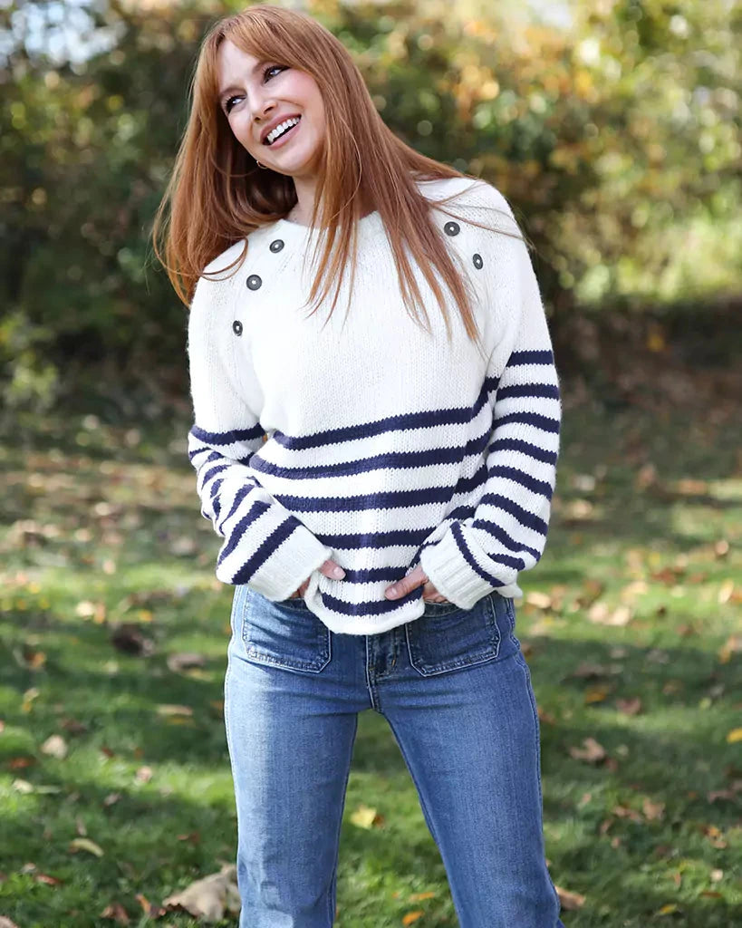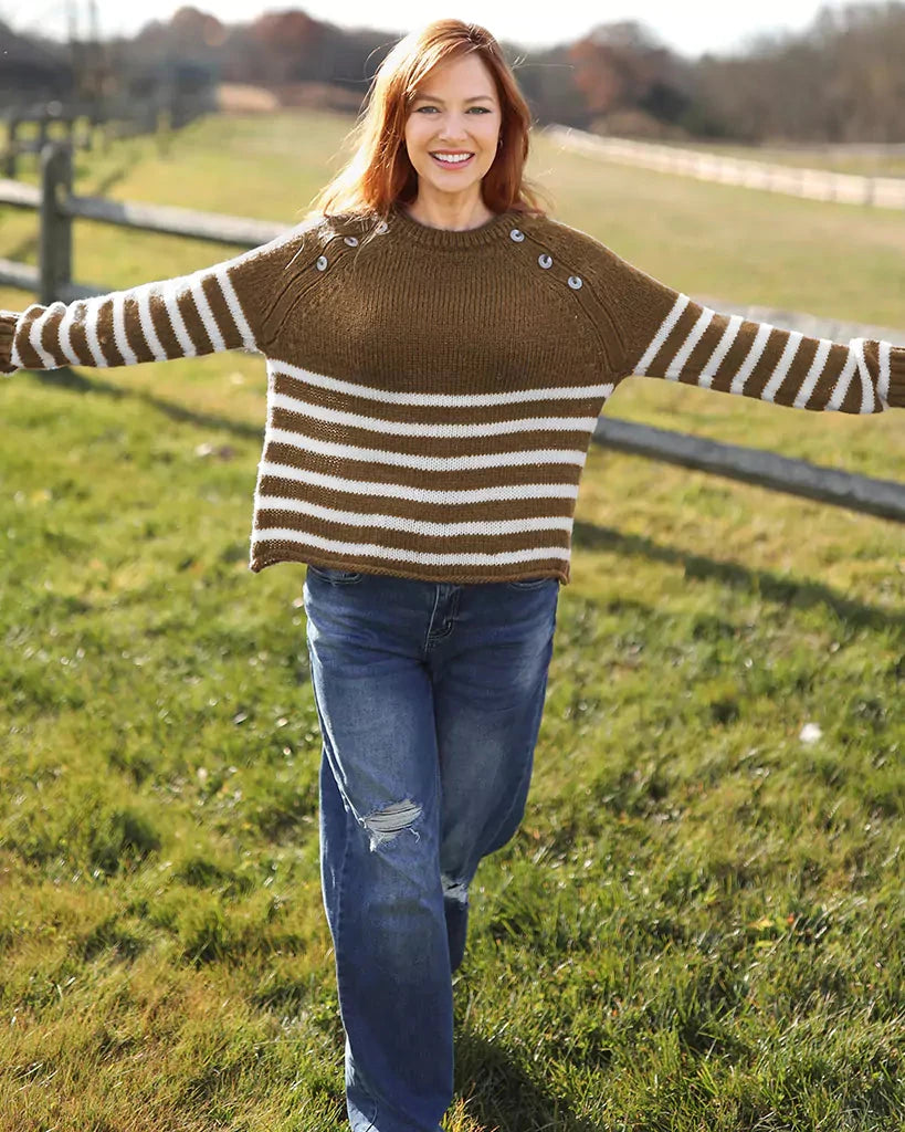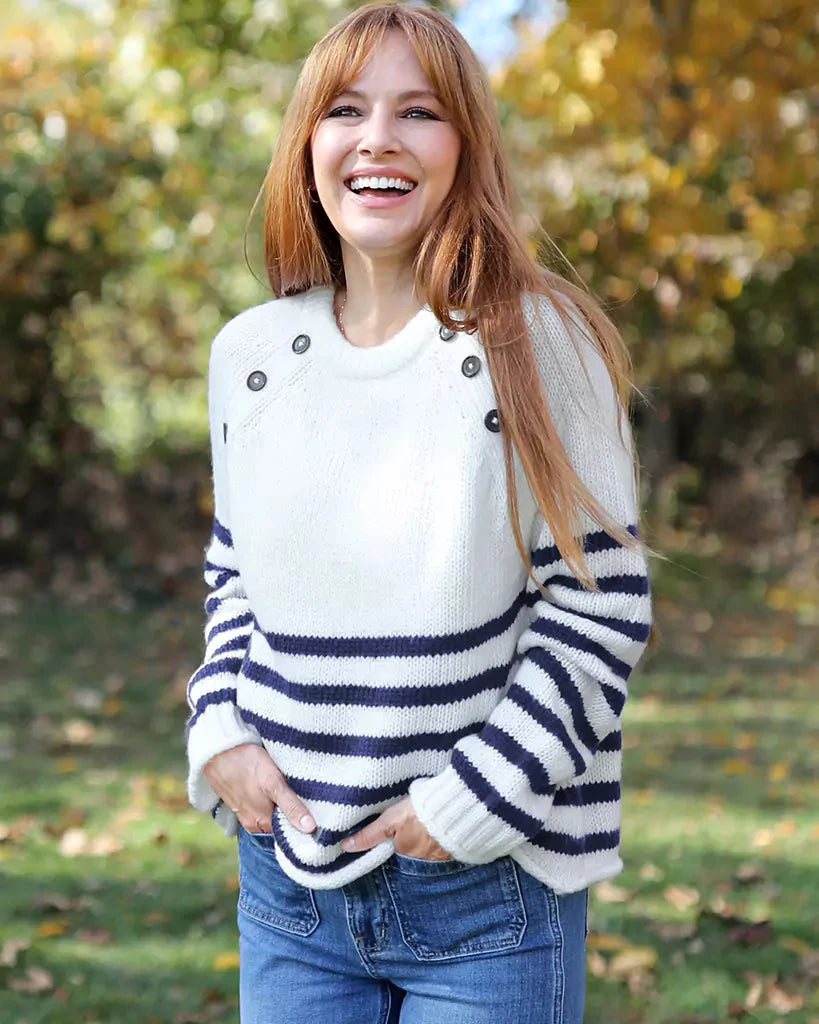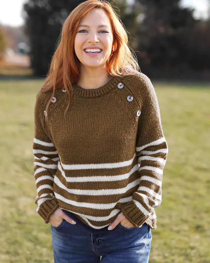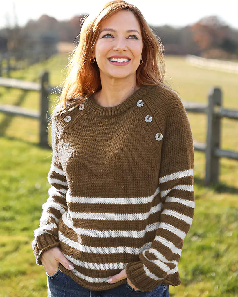 This sweater brings a classic nautical vibe with bold stripes from the mid-body down. Designed with raglan sleeves accented with buttons, it features ribbed finishes at the crew neckline and cuffs. Rolled edges at the cuffs and hem add a laid-back yet stylish touch.
