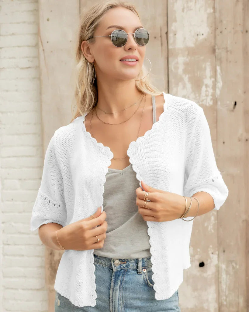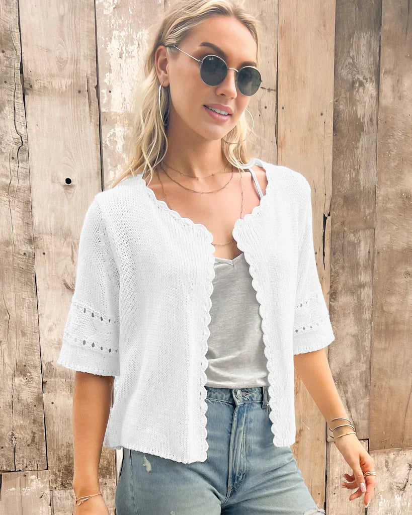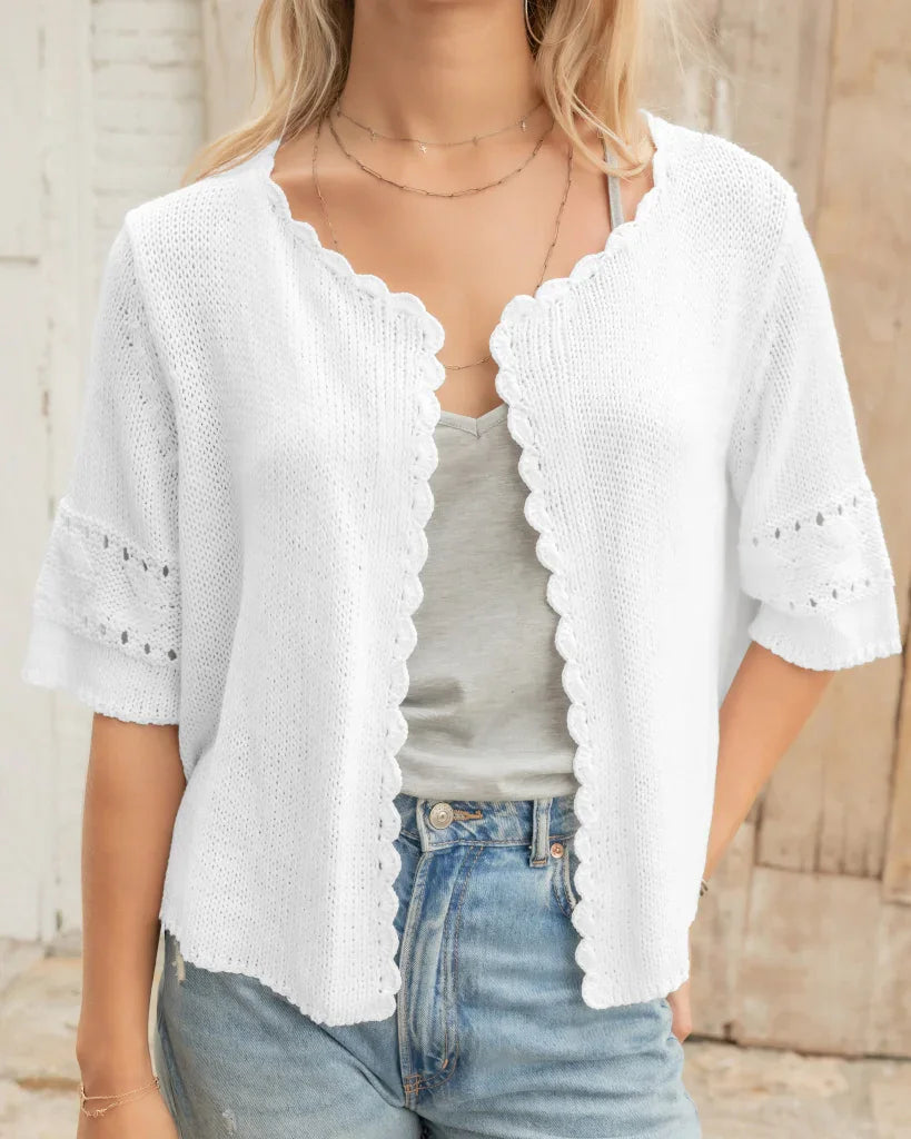 Knit from our soft, lightweight, and breathable cotton blend yarn, this super-cropped cardigan offers a comfortable and airy feel. Scalloped edge finishing and open-knit details on the half sleeves add a touch of texture and style. The perfect piece for casual outings.