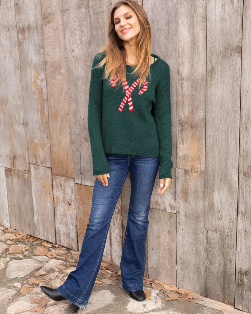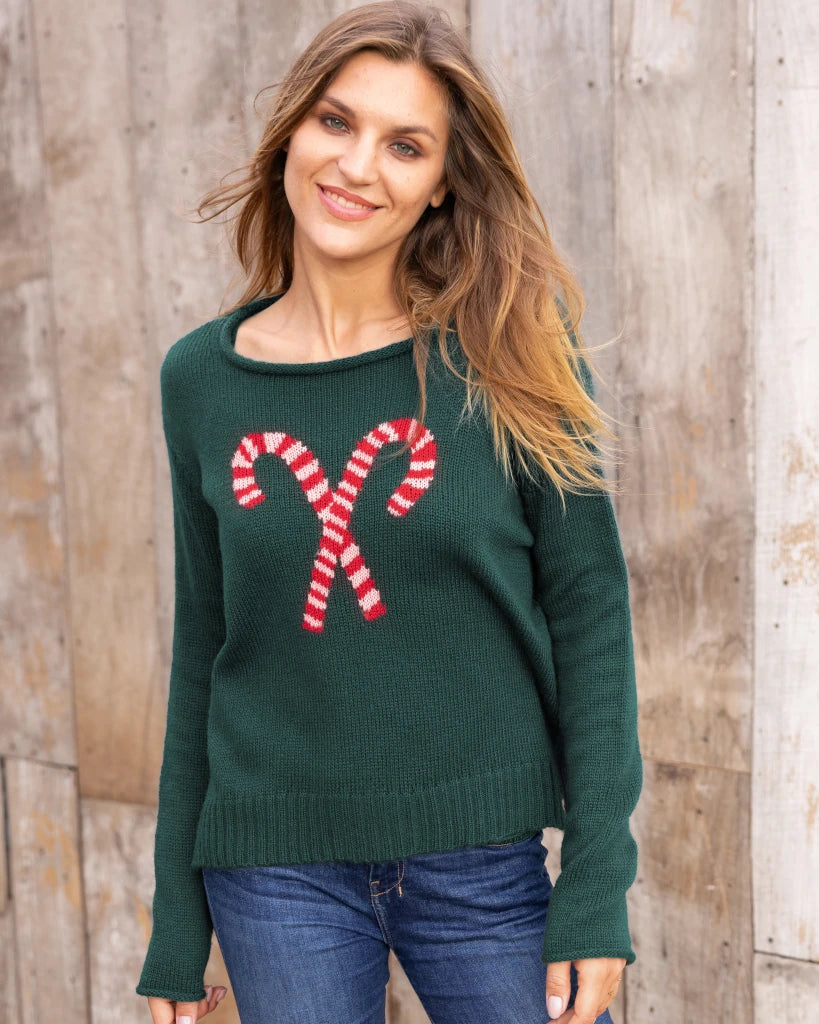 Incredibly soft and lightweight crew. The knit has a flattering, boxy fit, complemented perfectly by fitted sleeves. Details include ribbed finishes on the hem and a rolled-edge neckline. A candy cane graphic featured at the center of the sweater makes it perfect for Christmas Day.