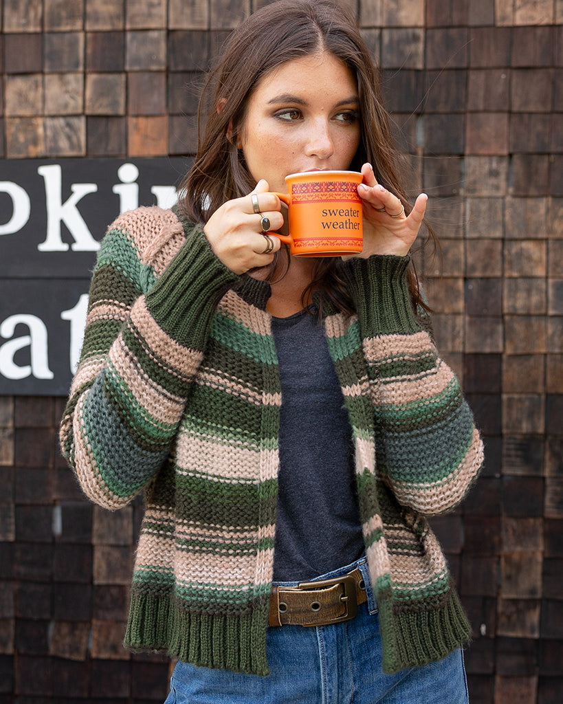 Chunky, cozy, and full of fall vibes, the Inez Cardi features bold stripes in rich autumn tones, crafted from a soft and slightly textured chunky yarn blend. Designed with a relaxed super cropped fit, this raglan-sleeve cardigan is finished with ribbed edges at the neckline, cuffs, and hem for a clean, polished look. The perfect throw-on piece to layer over anything from tanks to dresses, it adds both warmth and the perfect fall feel to your outfit.
