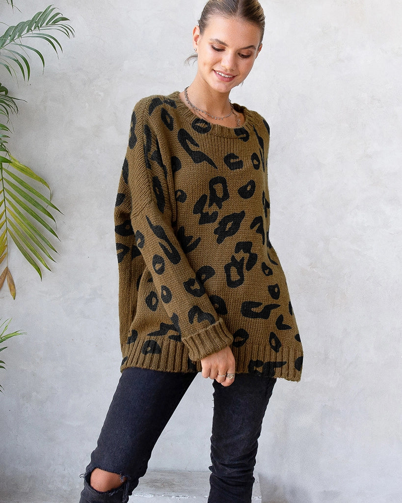 This sweater features a hand-printed leopard graphic, giving each piece a one-of-a-kind look. Designed with a relaxed boyfriend fit and dropped sleeves, it’s finished with ribbed edges for a laid-back yet refined touch. No two are exactly alike, making this a truly unique addition to your wardrobe.