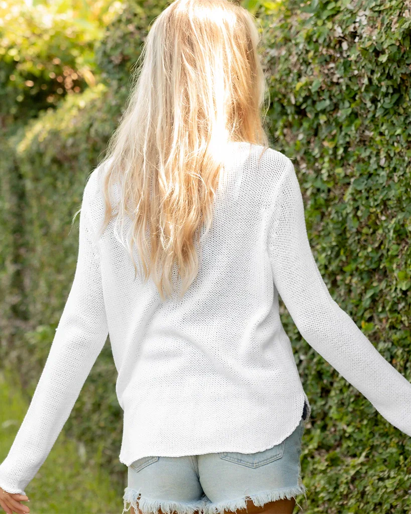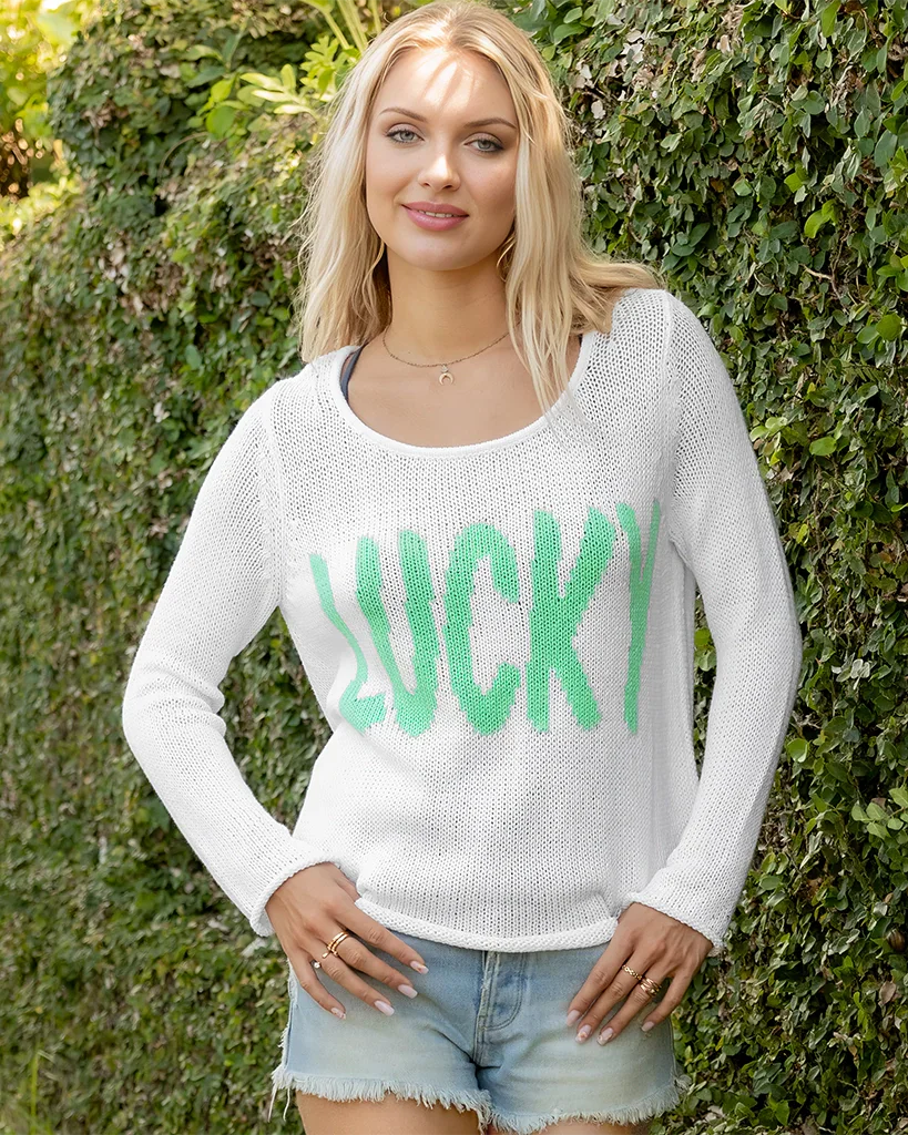 Knit from our soft, breathable, and luxuriously soft cotton-blend yarn, this crewneck offers a flattering, relaxed fit. The word "LUCKY" is knit directly into the center of the sweater, making a bold statement. Additional details include a rounded hem with longer back and side slits, giving this top versatile styling options – tuck it, knot it, belt it, or simply let it hang loose.