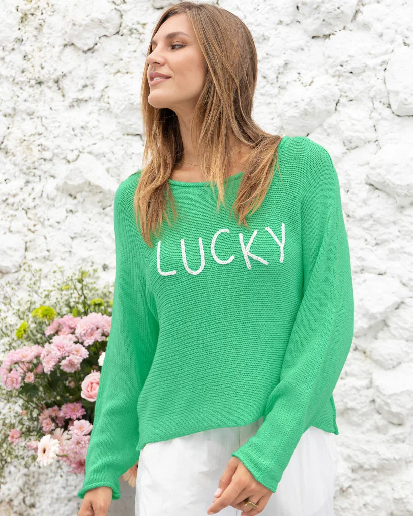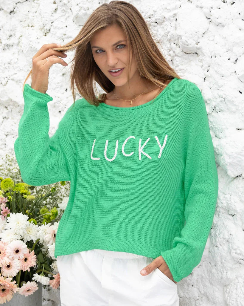 Crafted from our signature cotton blend yarn with a soft, breathable hand feel designed for transitional weather. The word LUCKY is embroidered at the center front, adding a refined graphic detail with subtle texture.