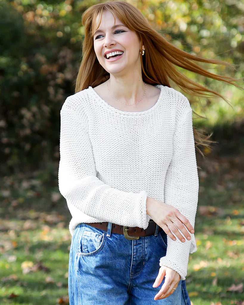 The cropped, boxy fit, balanced with a crew neckline is super flattering and keeps you feeling cool. Knit using our cotton blend yarn, this versatile top works perfectly with denim or as a cover-up over a bathing suit.