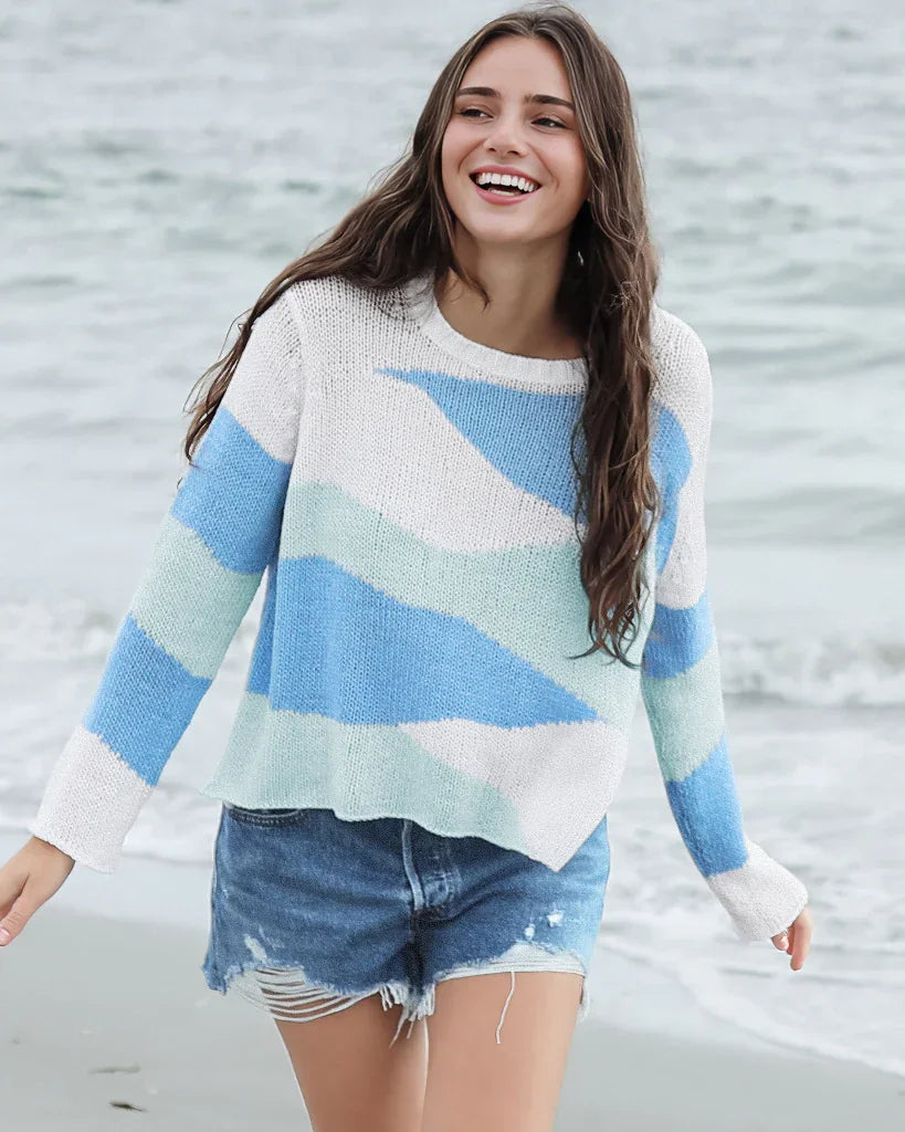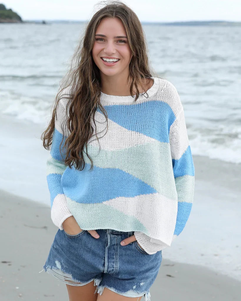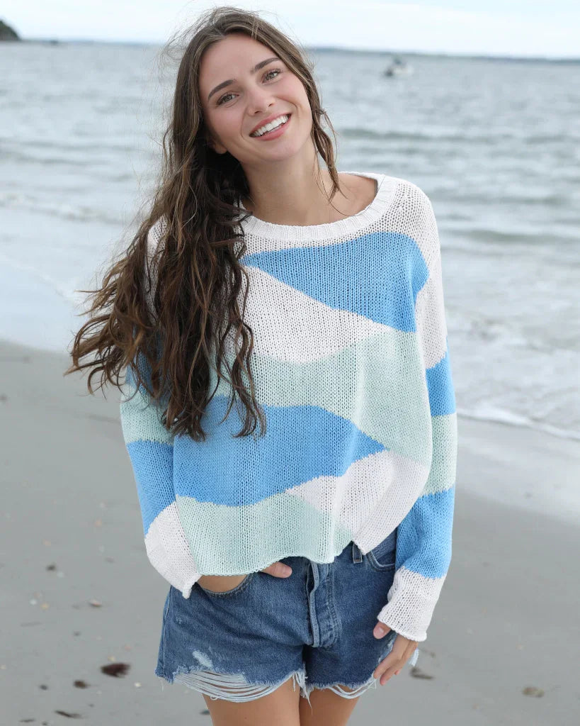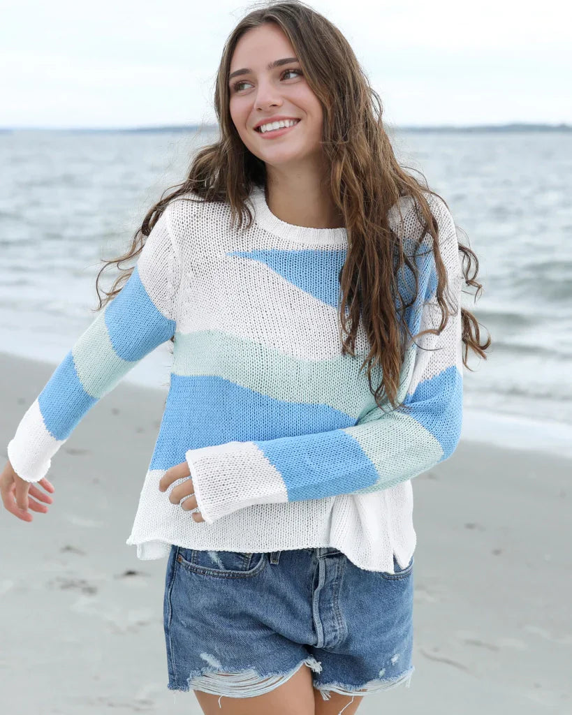 Incredibly soft and lightweight, this knit is made in a mix of muted tones to create an effortless, beachy stripe. The open-stitch texture feels airy on the body, while the boxy silhouette and slouchy drape give it that perfectly relaxed look. Finished with a ribbed crew neckline and subtle side slits for easy movement and a flattering, laid-back fit.