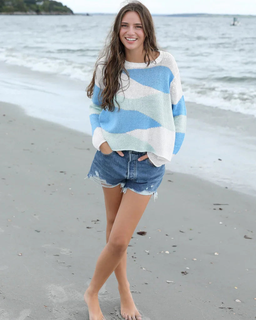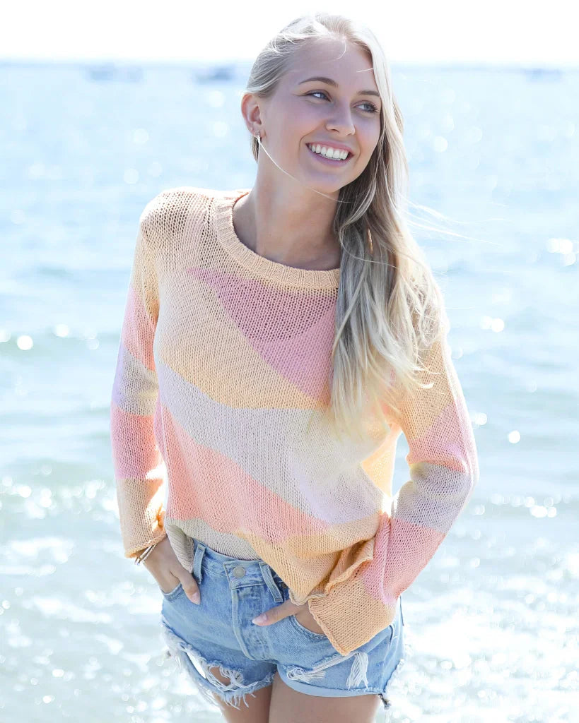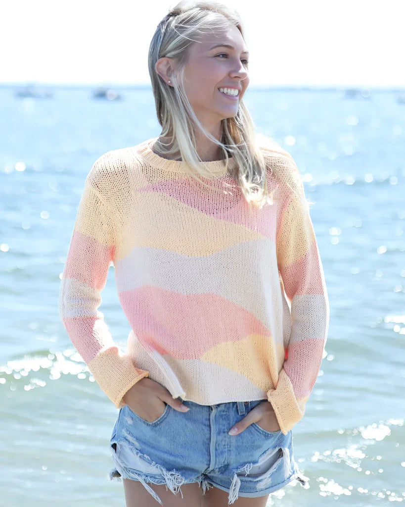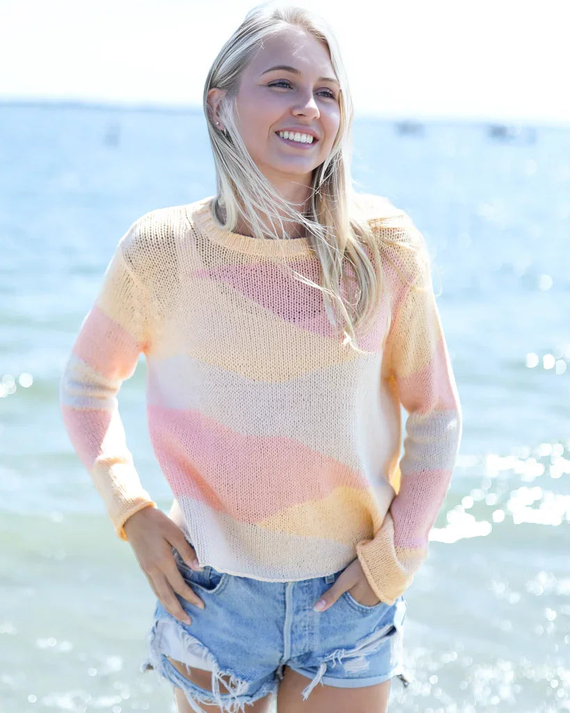 Incredibly soft and lightweight, this knit is made in a mix of muted tones to create an effortless, beachy stripe. The open-stitch texture feels airy on the body, while the boxy silhouette and slouchy drape give it that perfectly relaxed look. Finished with a ribbed crew neckline and subtle side slits for easy movement and a flattering, laid-back fit.