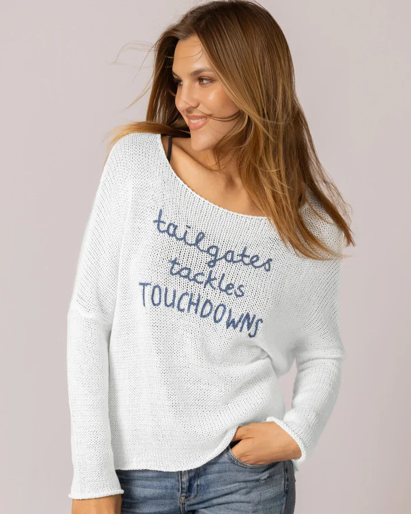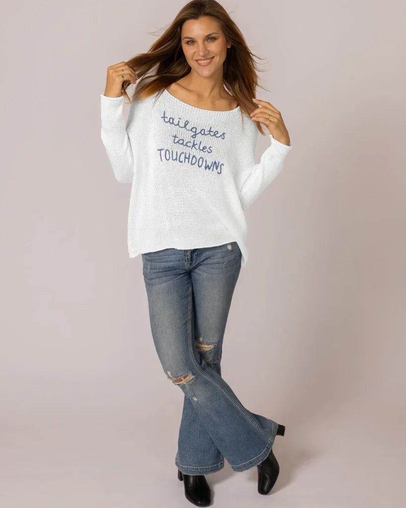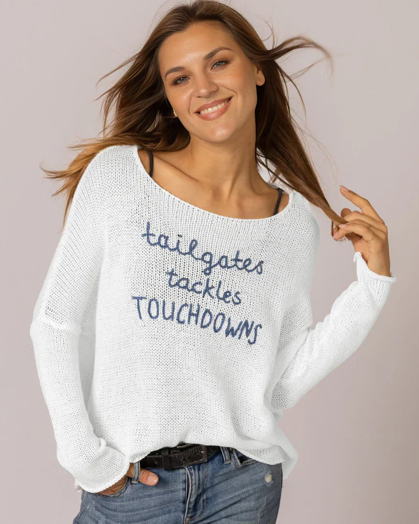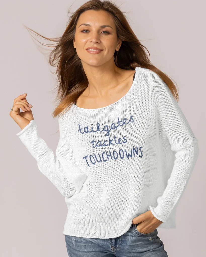 Amazingly soft and lightweight cotton blend top. This flattering boyfriend crew is offset with a fitted sleeve. The dropped shoulders create a laid-back yet chic look and feature the phrase 'Tailgates, Tackles, TOUCHDOWNS' embroidered on the center front—an ideal must-have for any football fan's wardrobe.