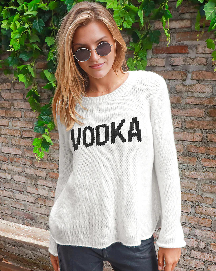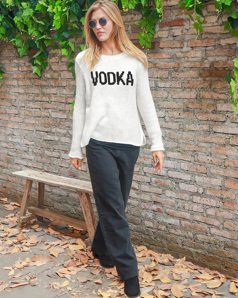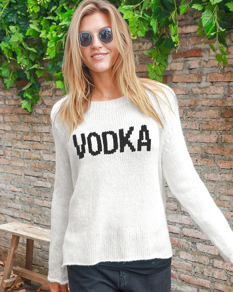 It's five o'clock somewhere! Super soft and cozy sweater with a boxy fit body and inset sleeves. The word "Vodka" is knit into the center front. Slightly cropped for a flattering fit.