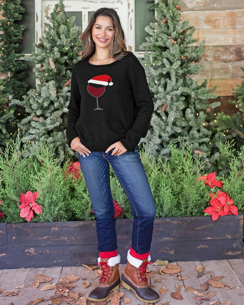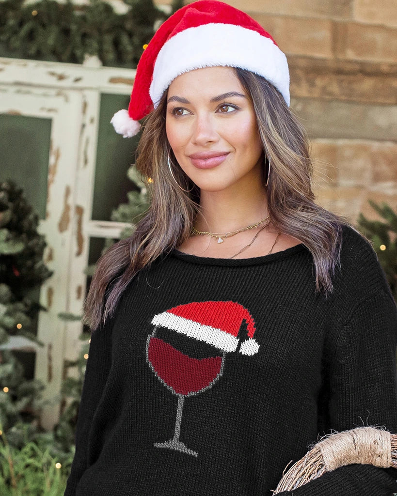 Raise a glass to holiday cheer! Perfect for festive gatherings or a cozy night in, this lightweight crewneck features a fun Santa and wine graphic knit directly onto the center front. Details include a rolled neckline and cuffs with a ribbed finish, and side slits at the hem.
