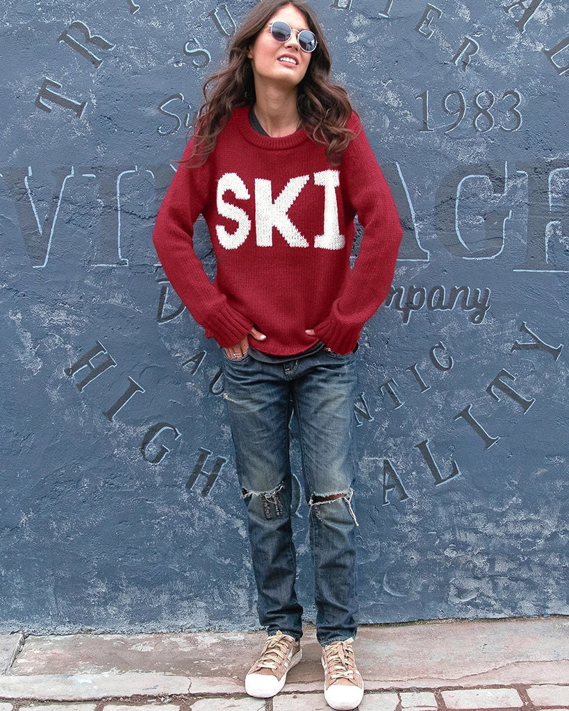 Buttery soft and super cozy crew with “Ski” knit directly into the center front. The Boyfriend fit is relaxed while the inset sleeves make it perfect for layering under coats in chilly weather or on the slopes. Rib details finish the neckline, cuffs and hem.