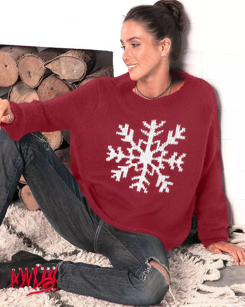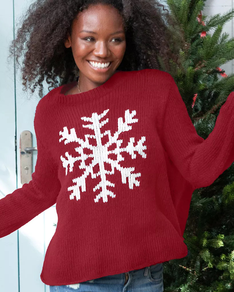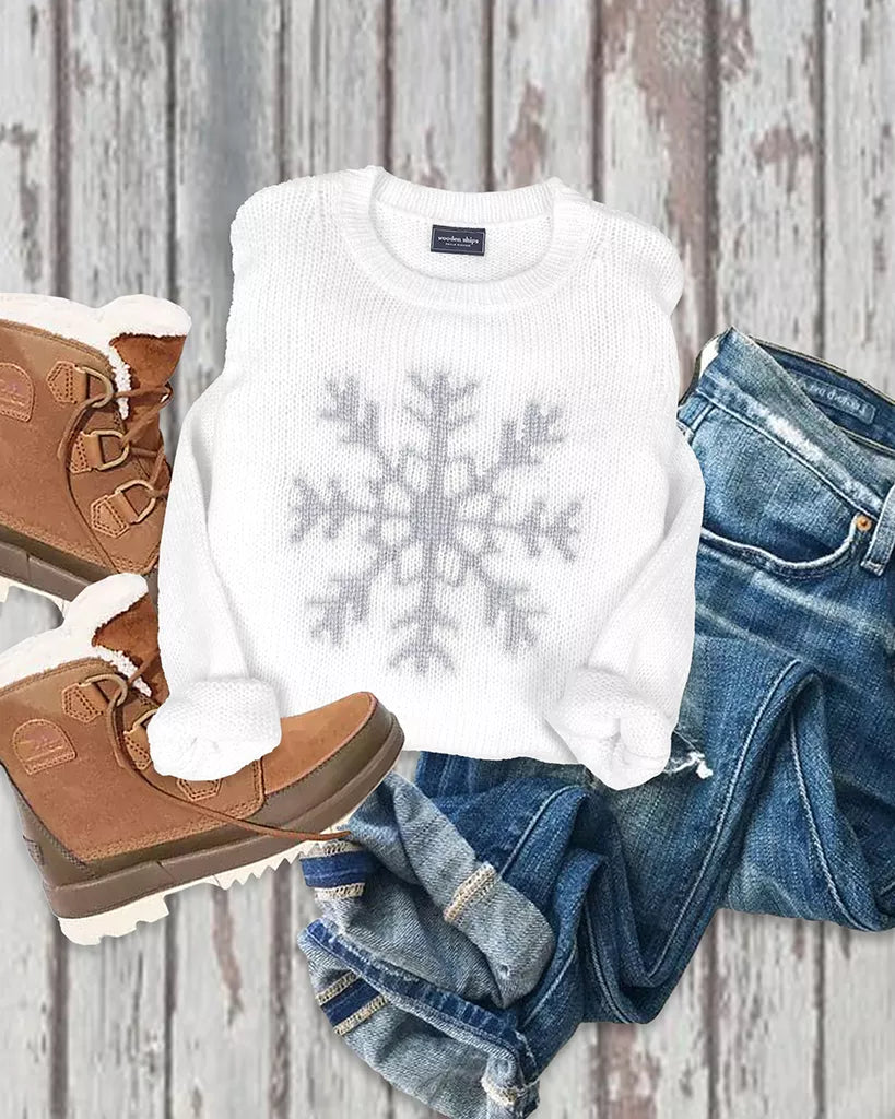 Incredibly soft and cozy, this crew has a snowflake knit directly into the center front. The fit is the perfect balance between relaxed and oversized for a super comfy, yet flattering look. Details include side slits and ribbing on the neckline and cuffs.