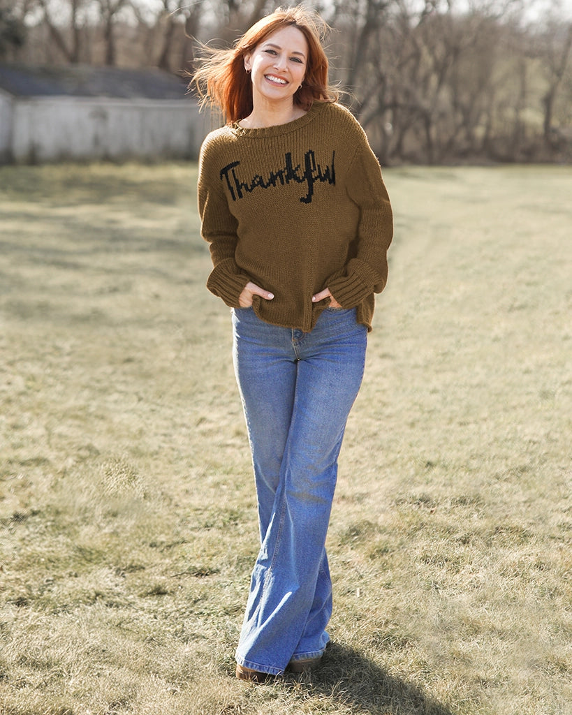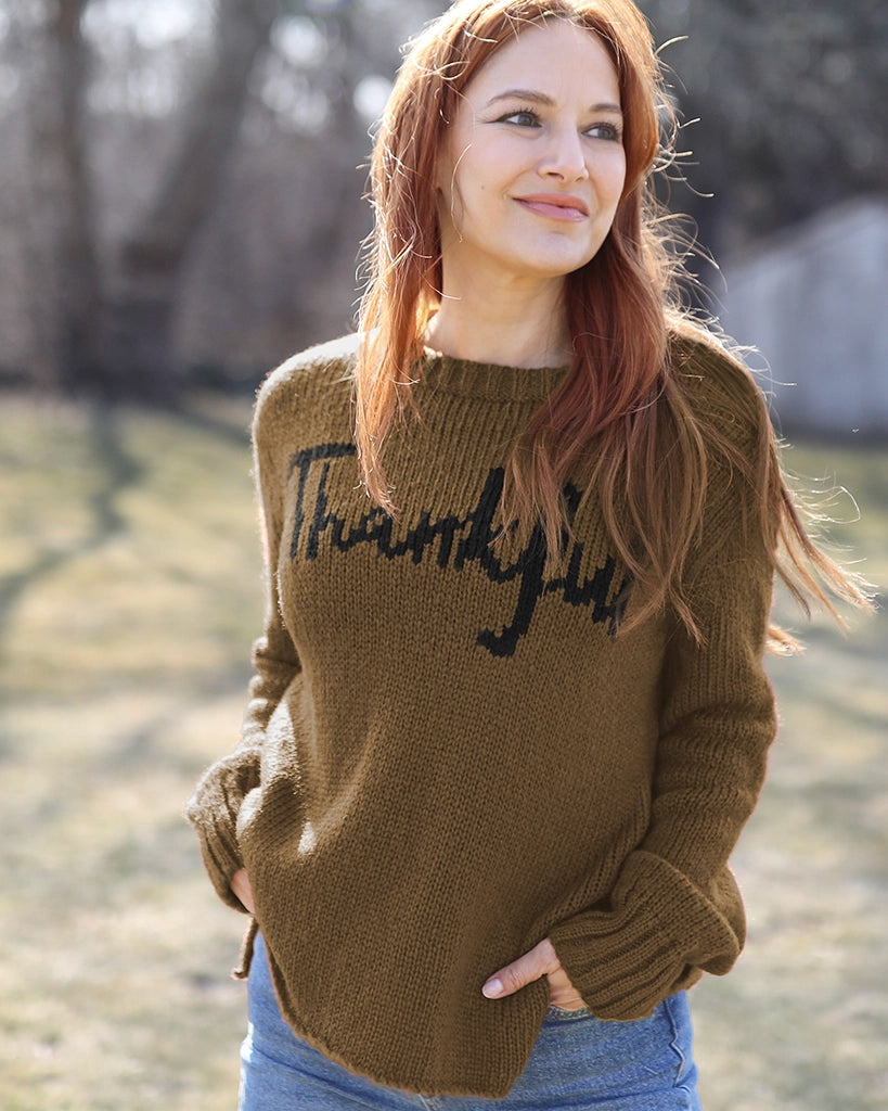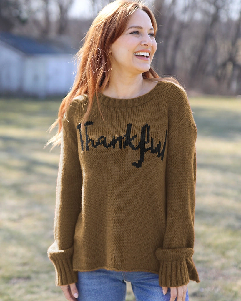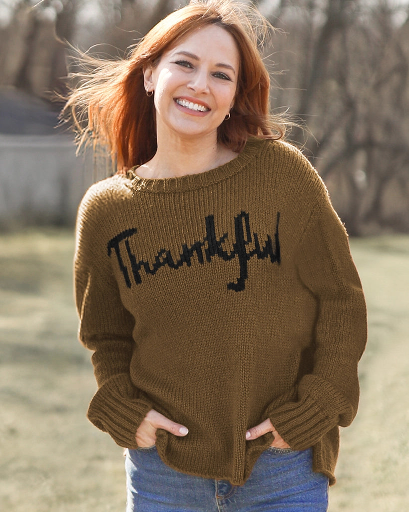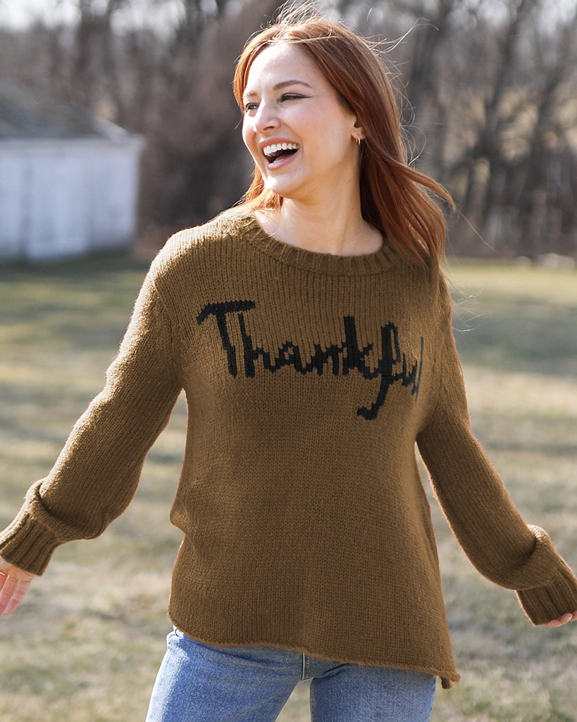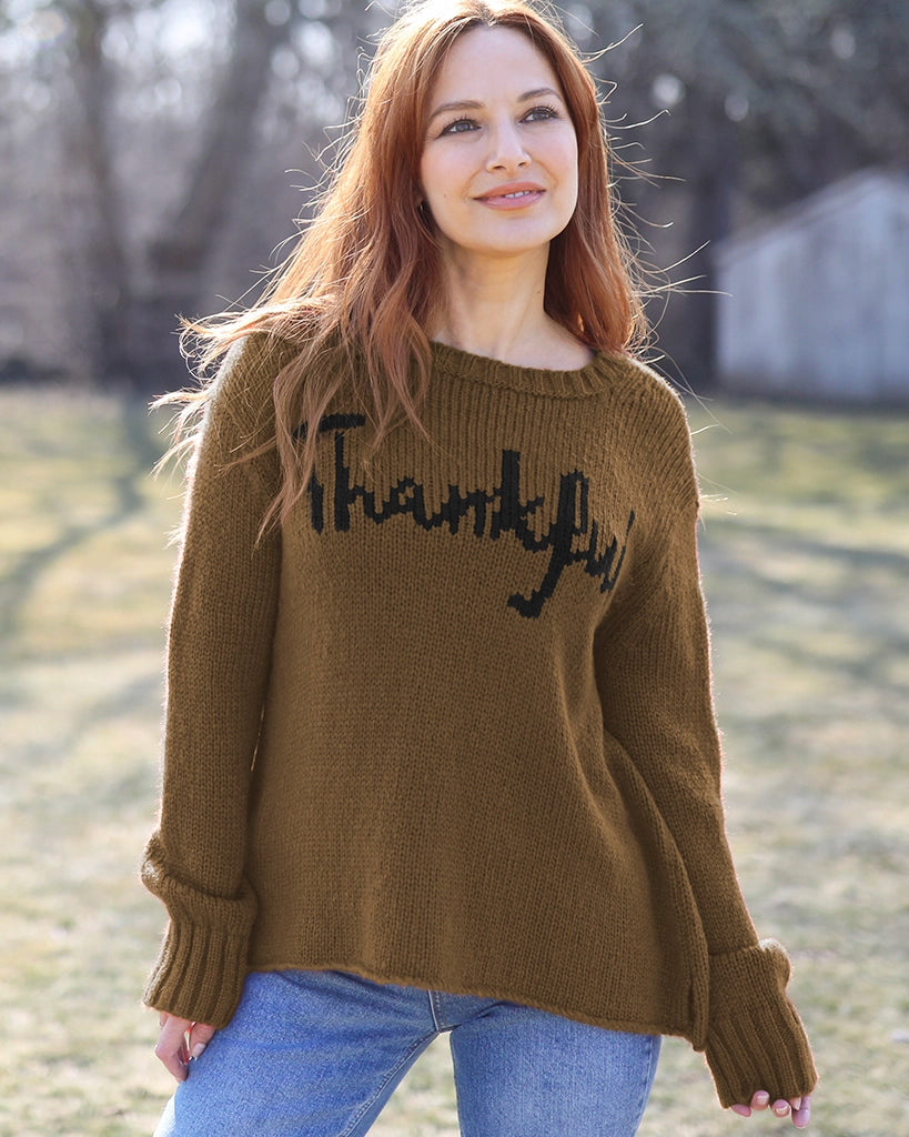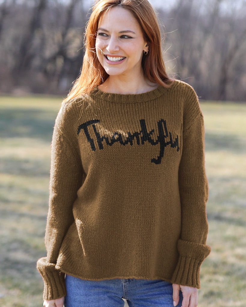 The perfect addition to your Thanksgiving outfit. Super soft and cozy, this chunky knit crew has a flattering, relaxed fit. The word 'Thankful' is knit directly into the center front. Details include slouchy, long sleeves finished with a cozy, chunky rib on the cuffs.
