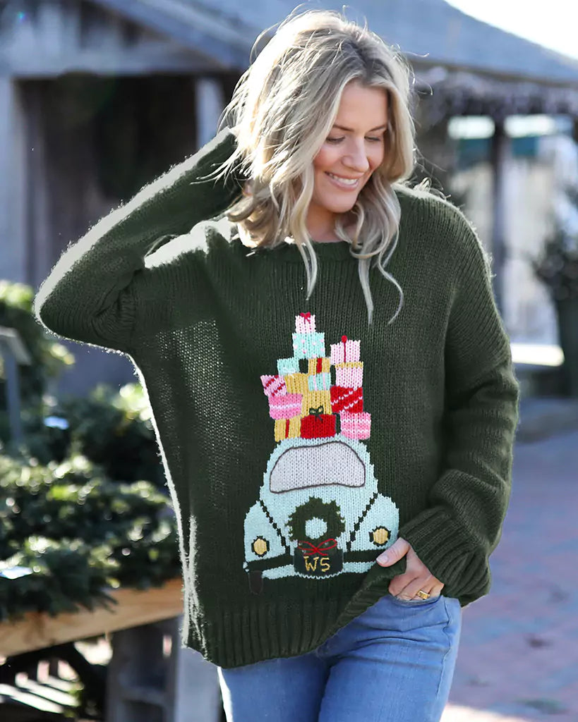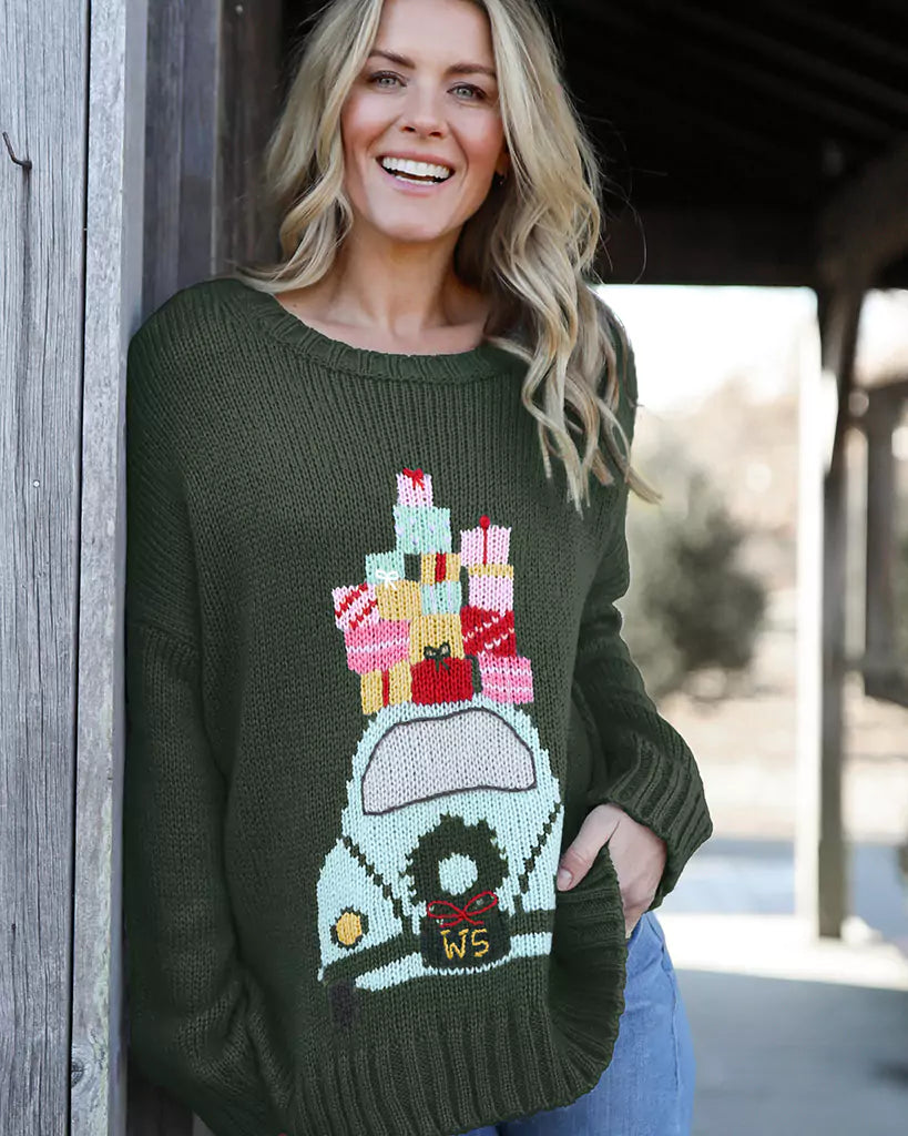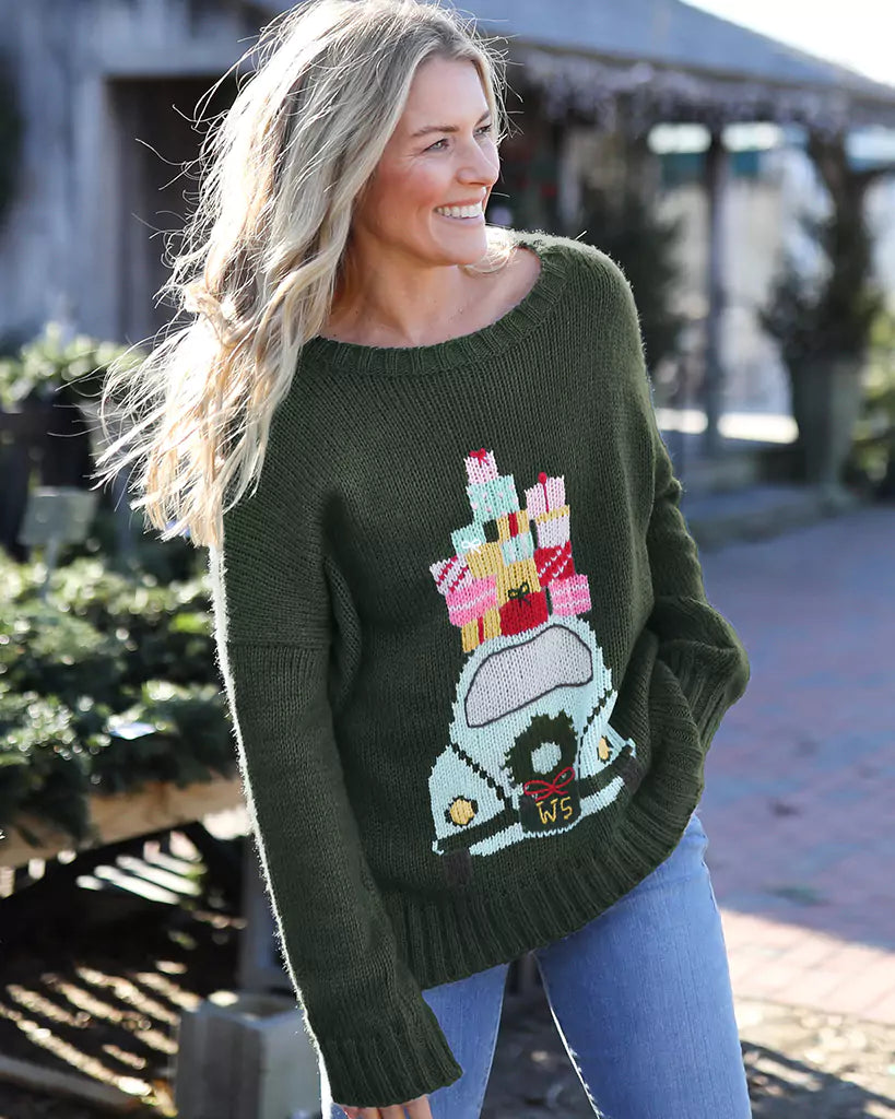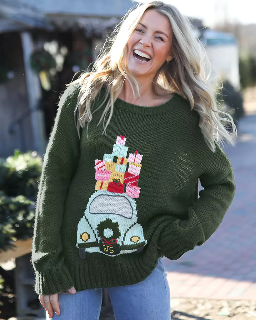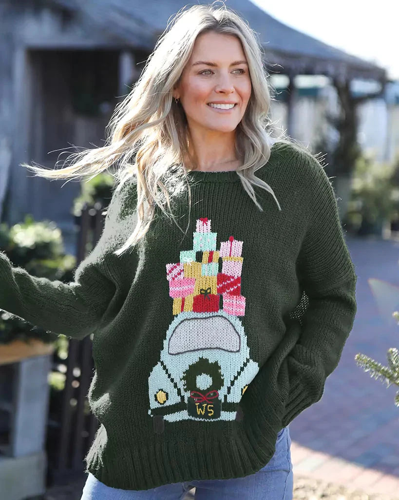 Cozy up in this adorable, fresh take on a Christmas sweater. Incredibly soft to the touch, dropped shoulder and perfectly oversized body make this both flattering and cozy at once. A holiday themed graphic is knit directly into the sweater. This versatile knit pairs with everything from denim to leggings.